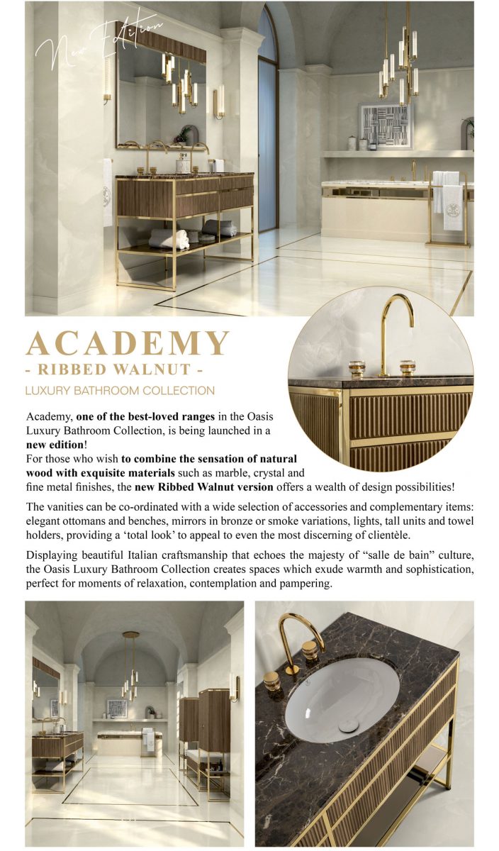 Academy, одна из самых любимых серий в коллекции роскошных ванных комнат Oasis, выходит в новом издании! Для тех, кто хочет объединить ощущение натурального дерева с изысканными материалами, такими как мрамор, хрусталь и тонкая металлическая отделка, новая версия Ribbed Walnut предлагает богатые возможности дизайна!