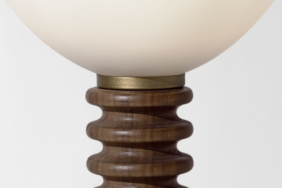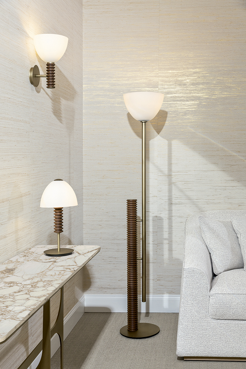 The Antonina family of lamps was engendered by the desire to marry contemporary taste with a unique and original design that is enhanced by the mixture of different materials such as walnut, bronze-effect metal, and glass that are combined together with skilled craftsmanship.