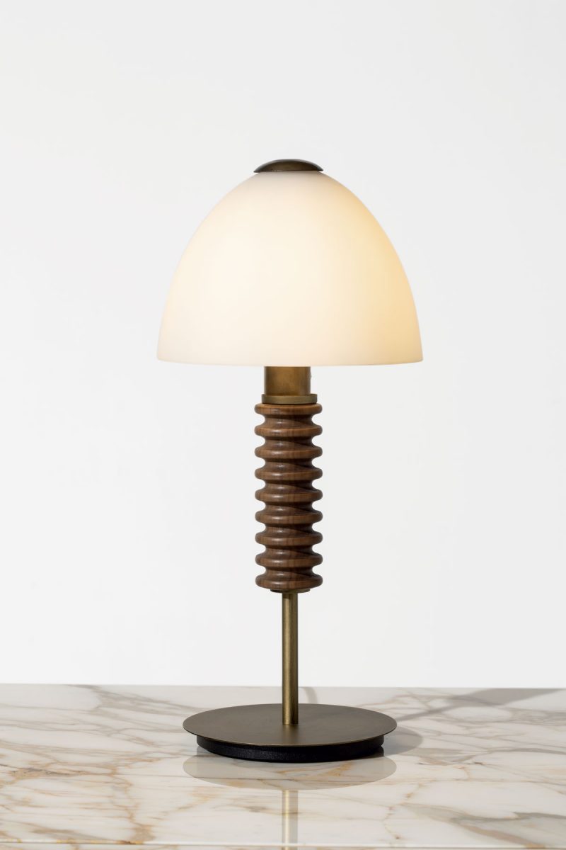 The metal structure with a bronze finish acts as a base and support as if it were a slender pedestal from which the contrasting solid wooden column emerges.