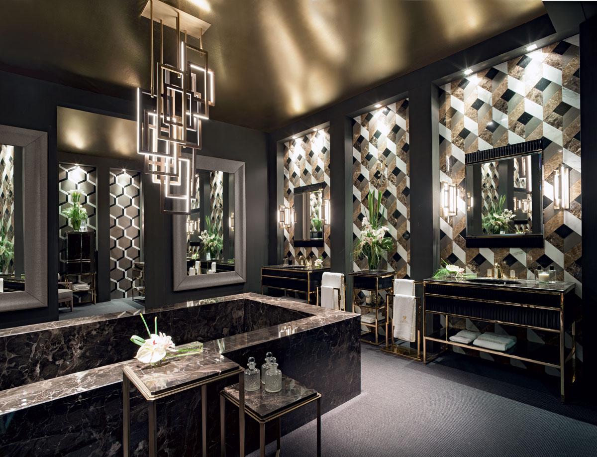 It seems every taste can be catered for, but for those who favour an Art Déco inspired ‘Salle de bain’, bold colours and precious materials are de rigueur. These include marble with veins running through it and high gloss lacquers with various surface textures like ribbed or diamond cut eff ects. These can then be paired up with precious metals such as gold and bronze in a choice of brushed, antique or glossy finishes, and even chrome for a visually striking black and white contrast.