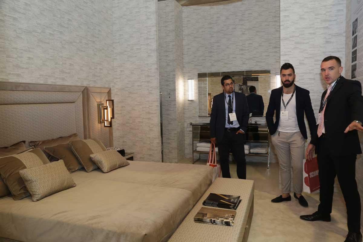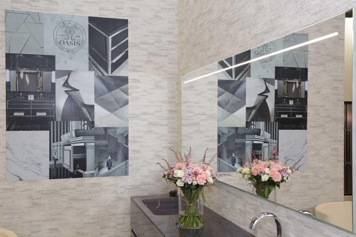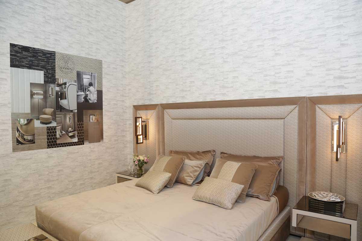 Oasis добился большого успеха, создав целую комнату, включающую согласованную обстановку спальни и ванной комнаты, выполненную в разных стилях. Кровать Louvre с мягкой обивкой из ткани с золотыми и карамельными акцентами была объединена с различными предметами интерьера ванной комнаты из коллекций Luxury и Master, чтобы показать, как мебель для ванной комнаты Oasis может удовлетворить самые разные стили.