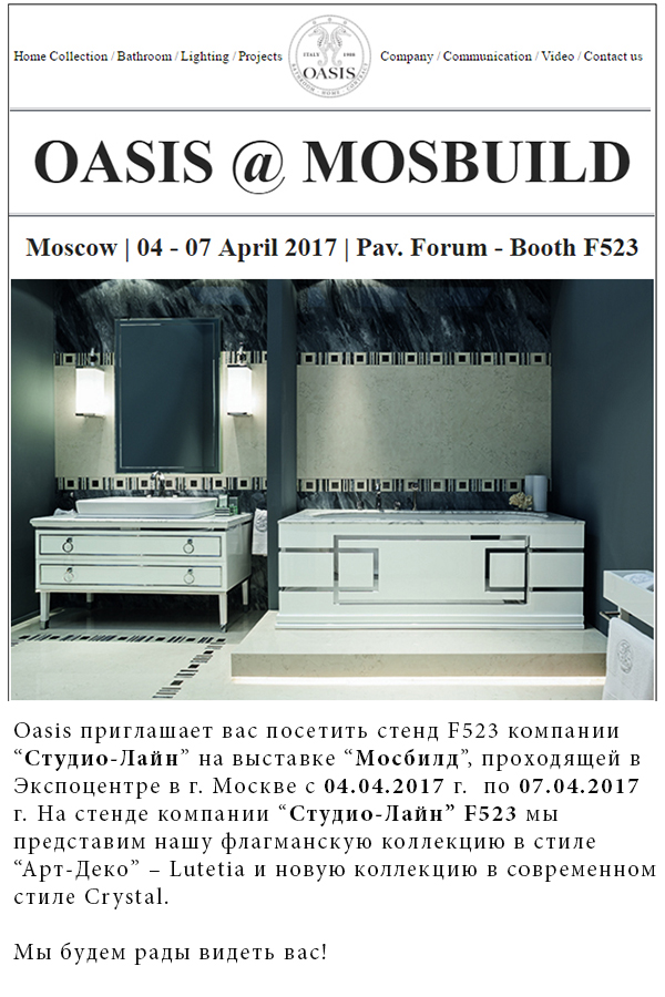 В сотрудничестве с компанией Studio Line компания Oasis представит коллекцию элитных ванных комнат: Lutetia и Crystal of Master Bathroom Collection — Oasis будет гостем на стенде Studio-Line (расположен в павильоне Форум — стенд F523).