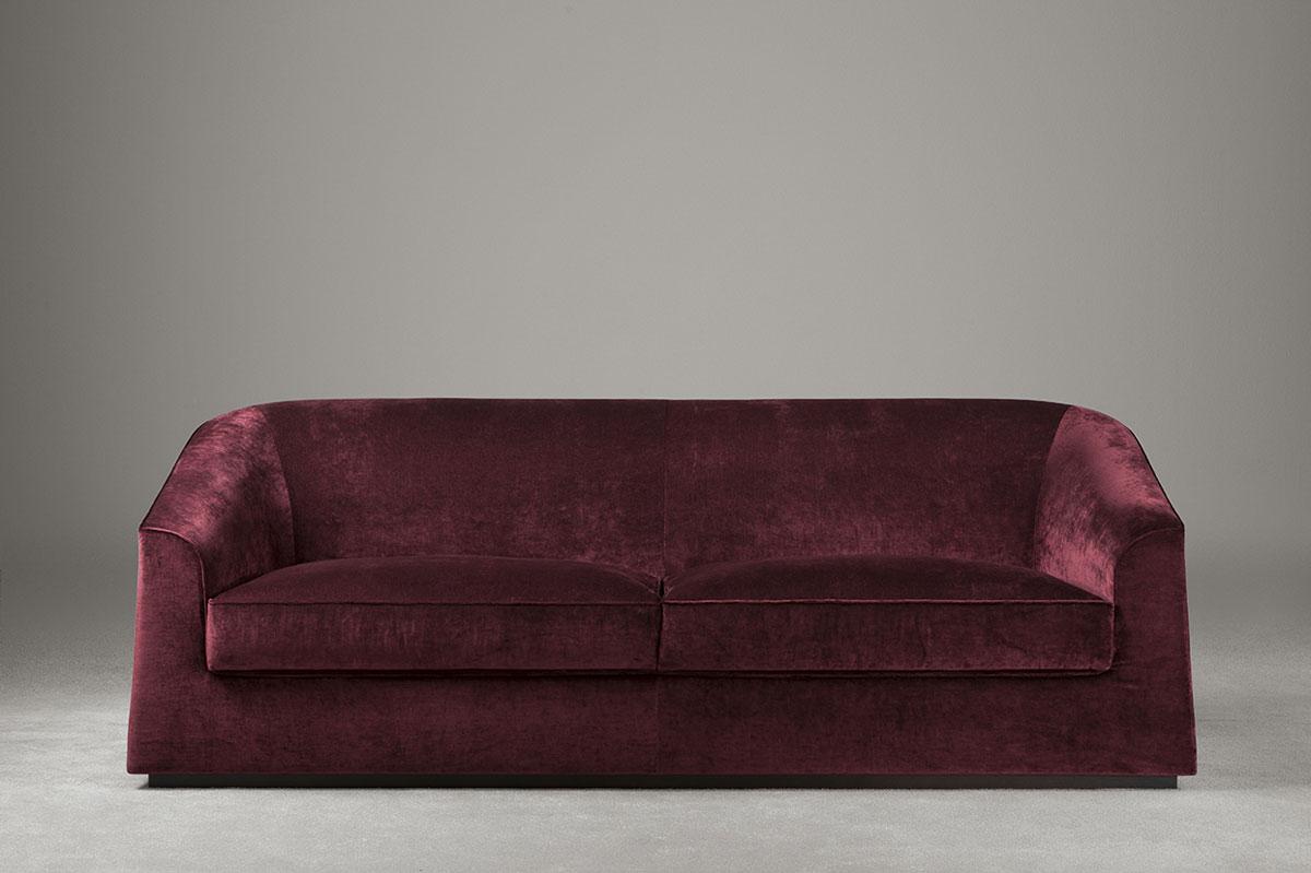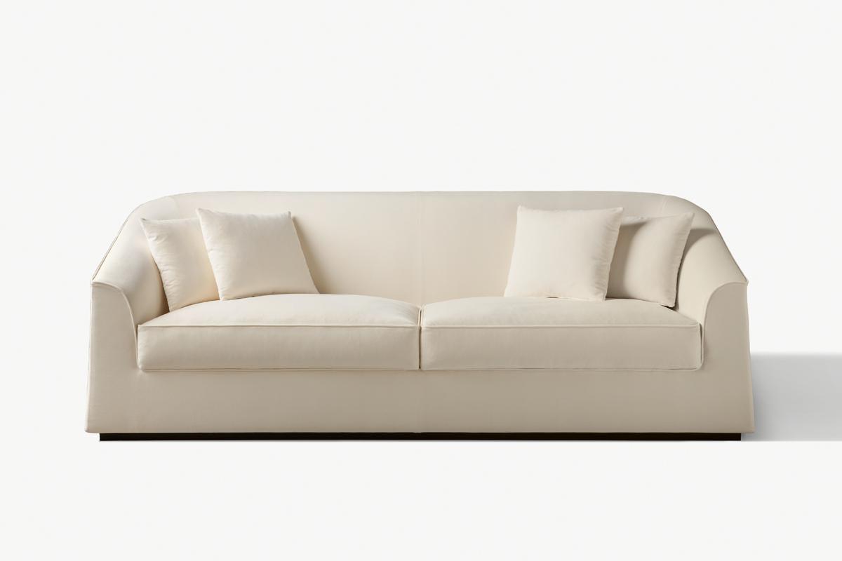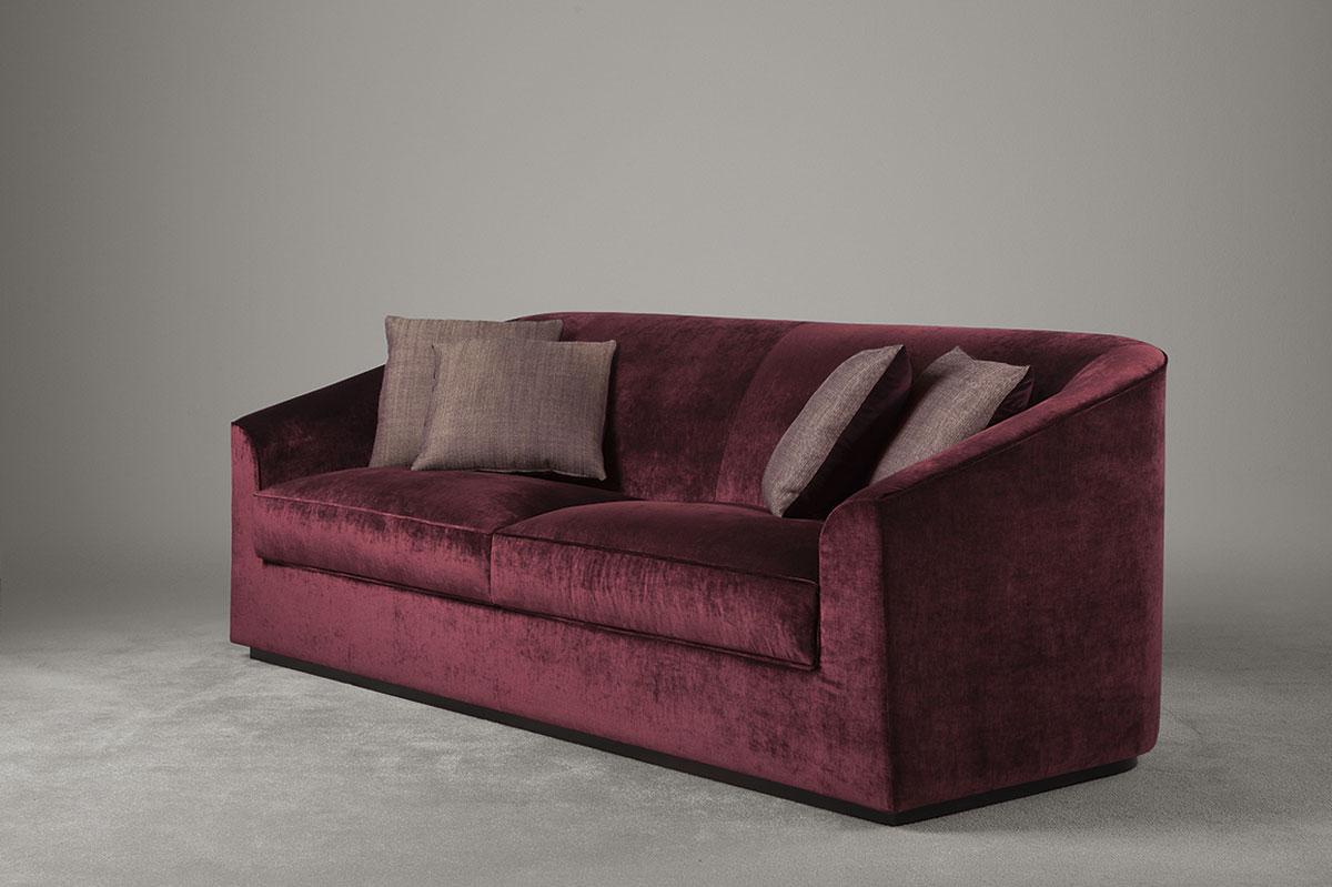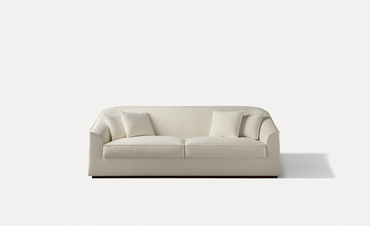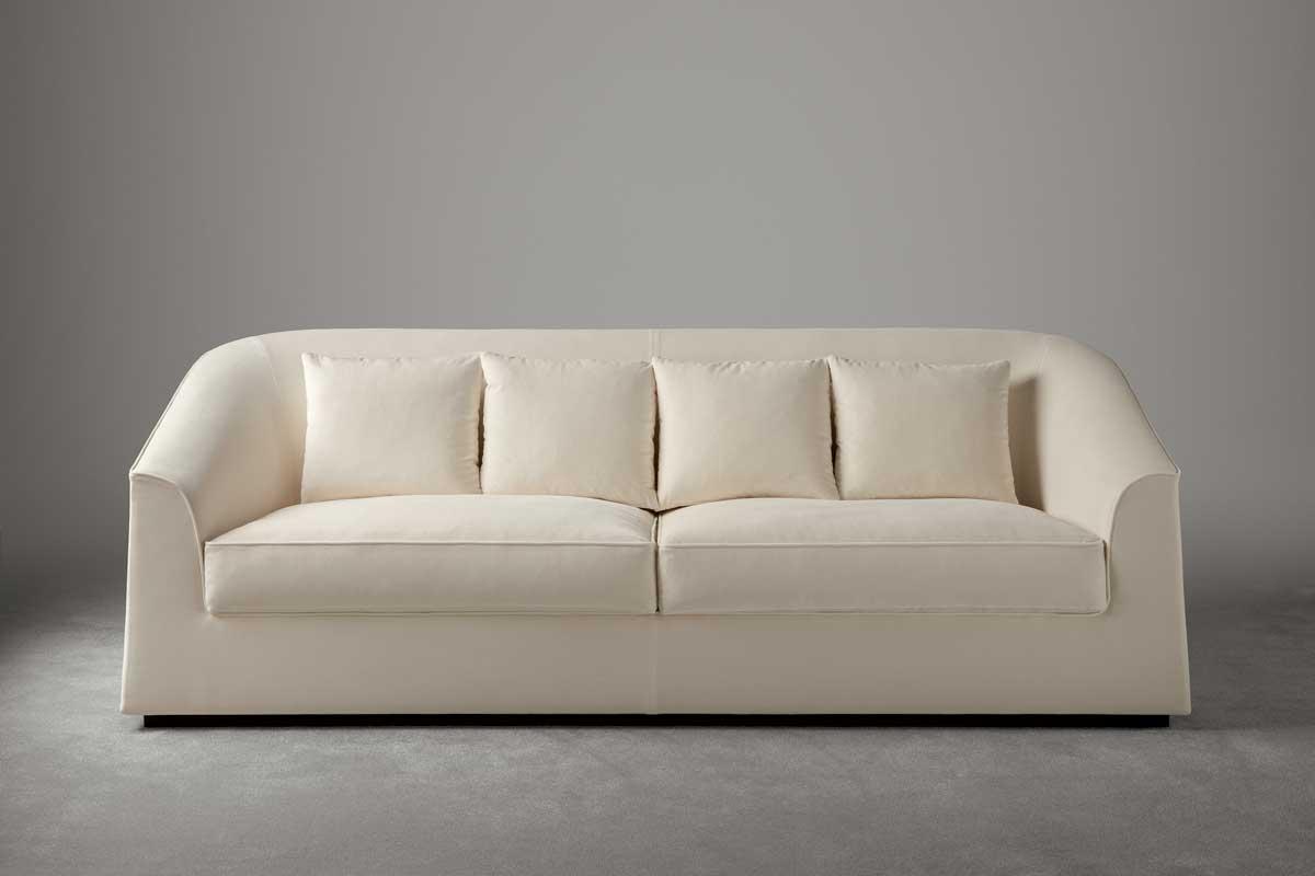 Divano disponibile in tre dimensioni, con basamento in legno massello di rovere o faggio, disponibile in tutte le finiture essenza e laccati. Struttura rivestita in poliuretano espanso con uno strato esterno in piuma d’oca. Le schiume di poliuretano adottate per gli schienali e per il rivestimento della scocca sono di prima qualità e a diversa densità, fissate direttamente alle cinghie elastiche. I cuscini decorativi sono in piuma d’oca. La cuscinatura della seduta è composta da una base in poliuretano espanso, da una parte centrale in piuma d’oca per i tessuti o in memory per le pelli e una parte esterna in Dacron. Il rivestimento può essere in tessuto o in pelle.