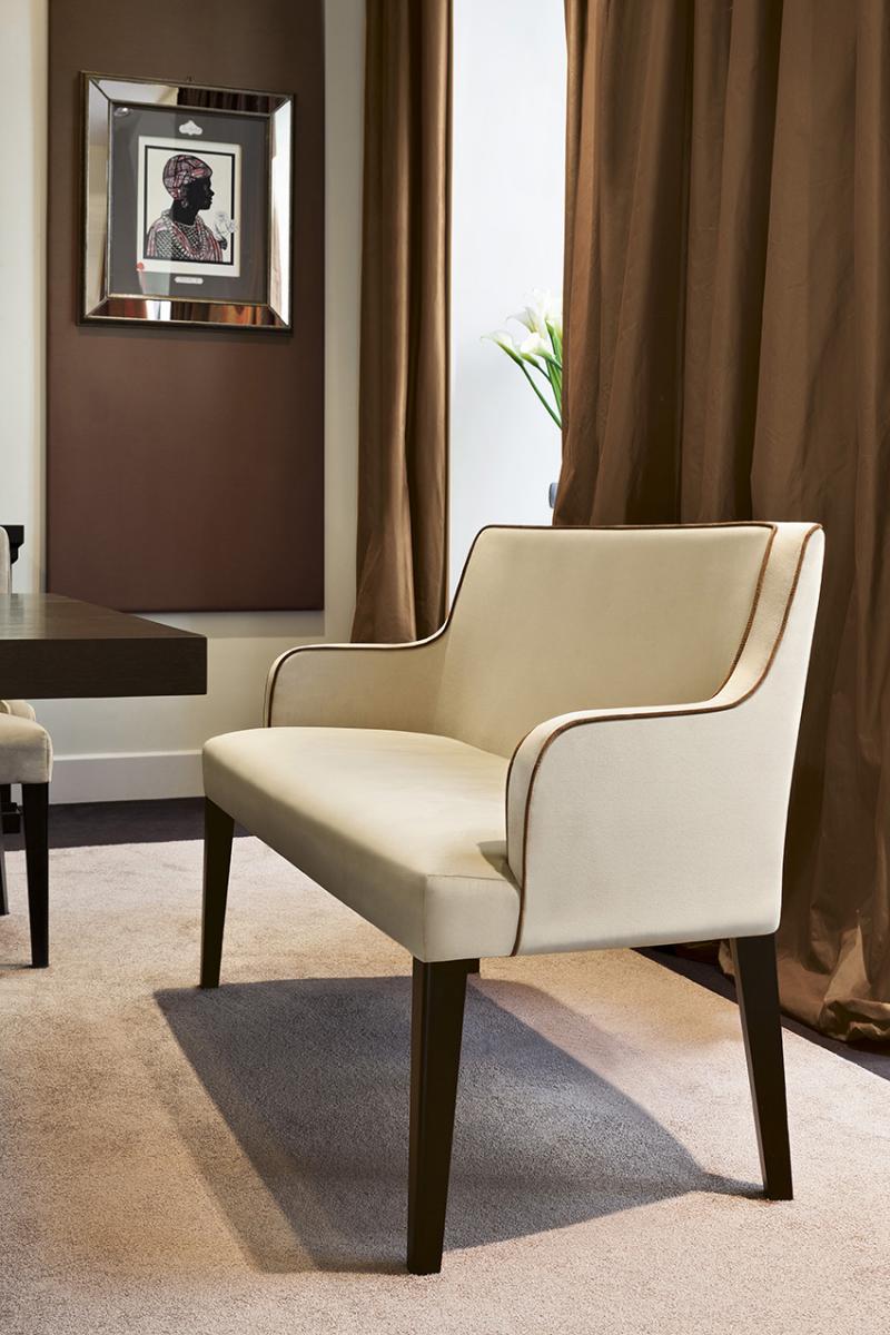 >Keywords: international style dining room, oak table, leather covering, cream hues, international style, golden lines, piping, luxury interior design, luxury interiors, deco design