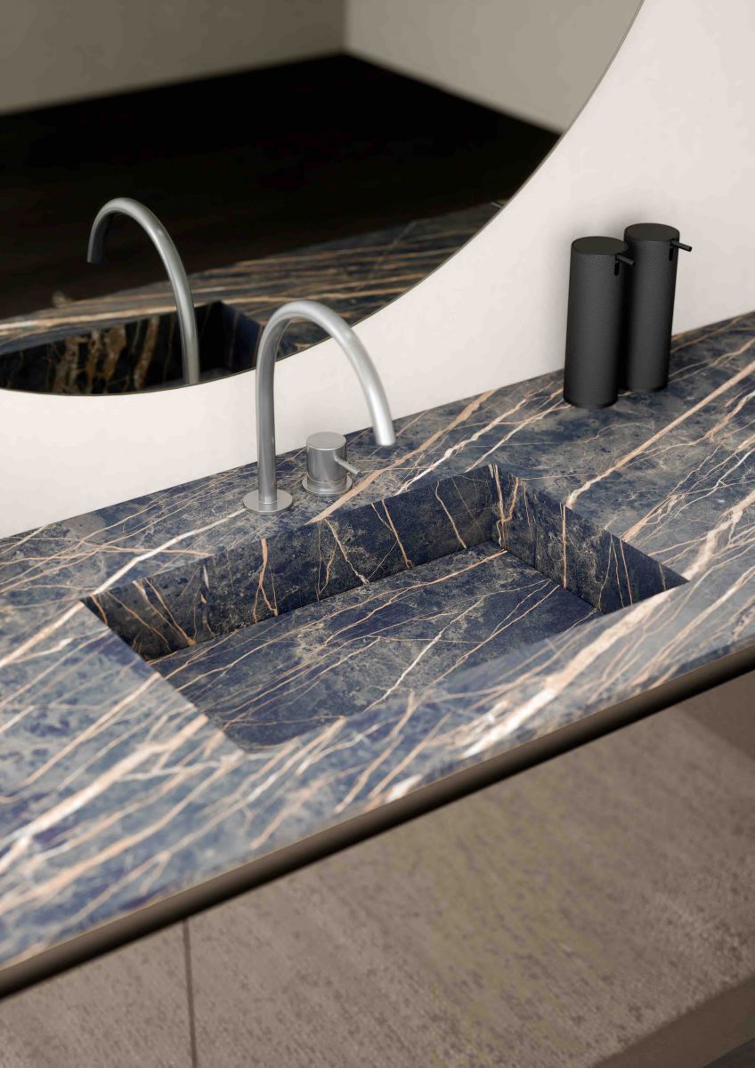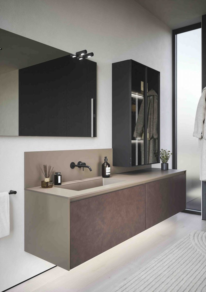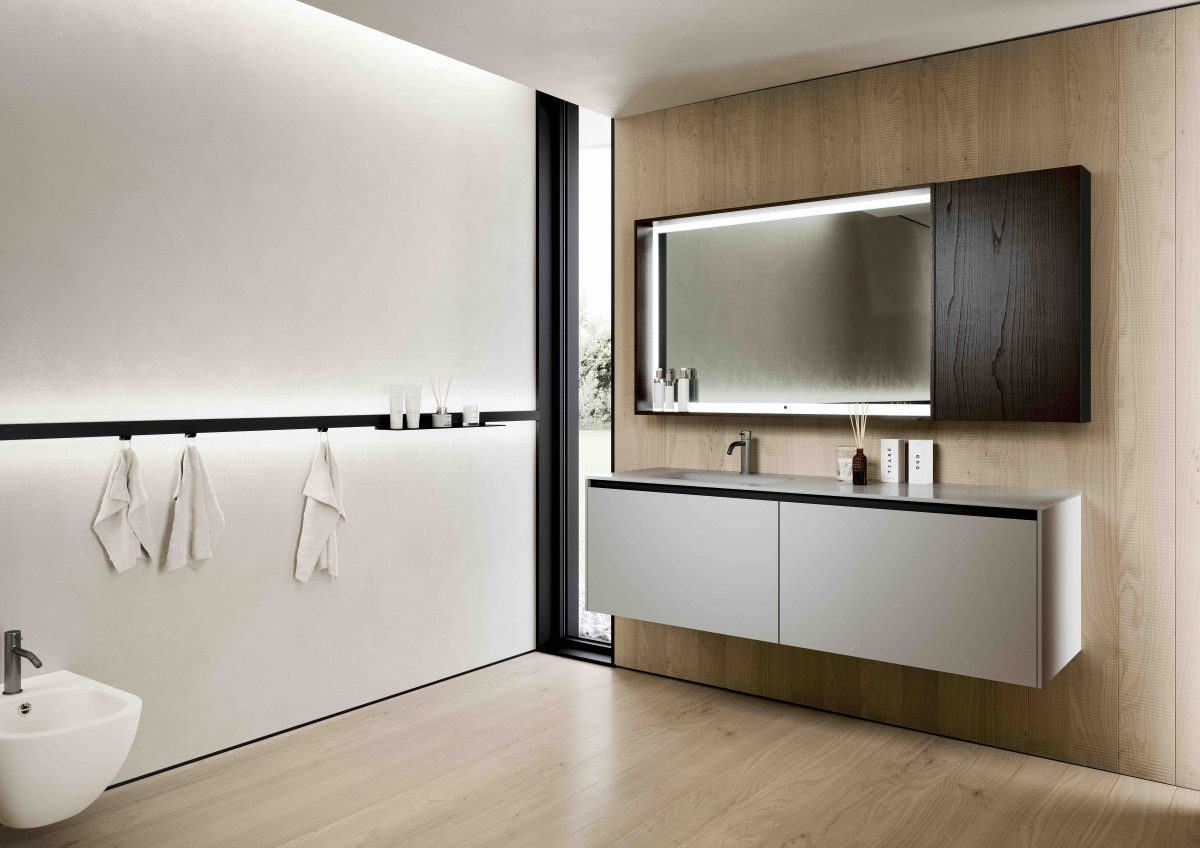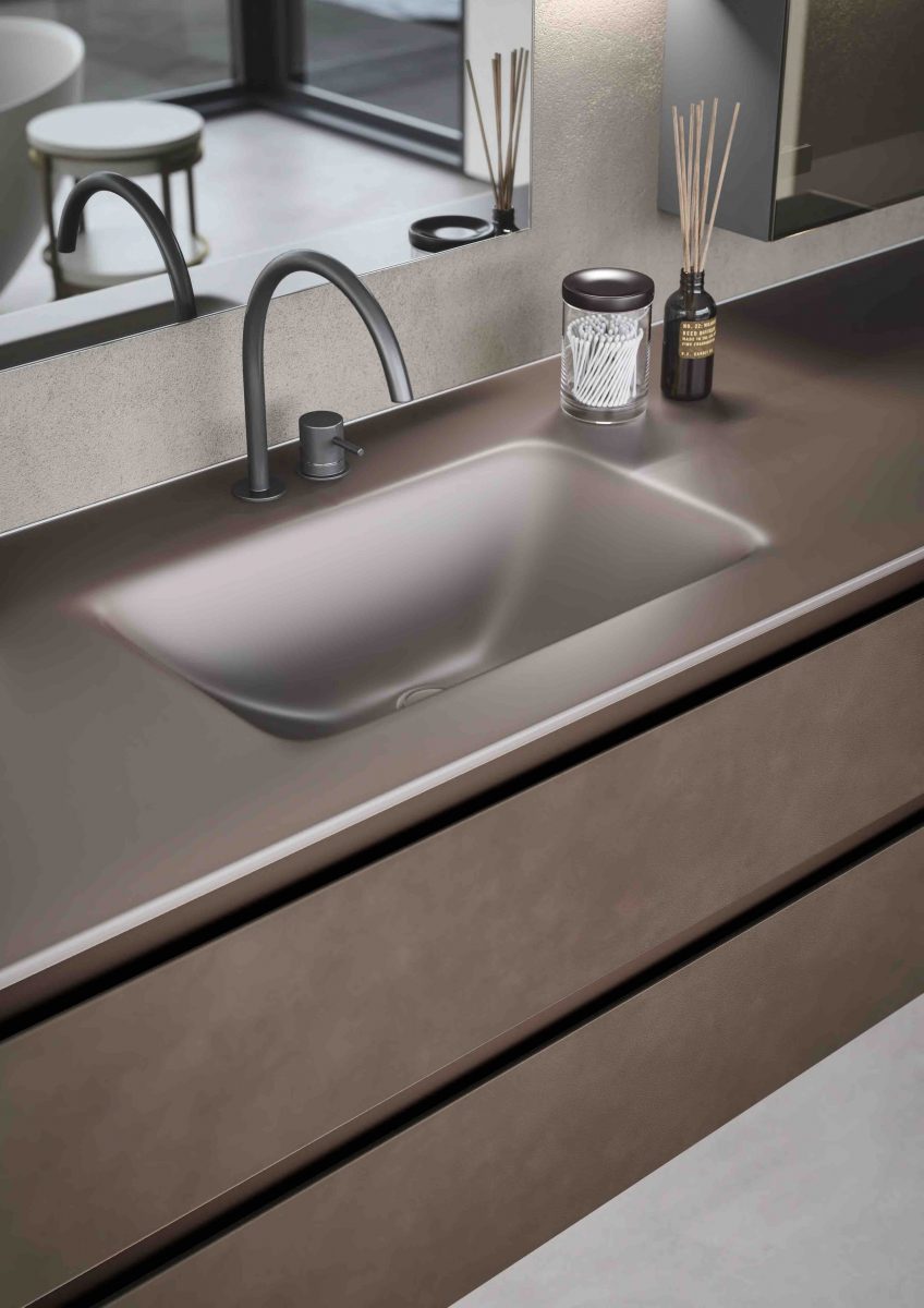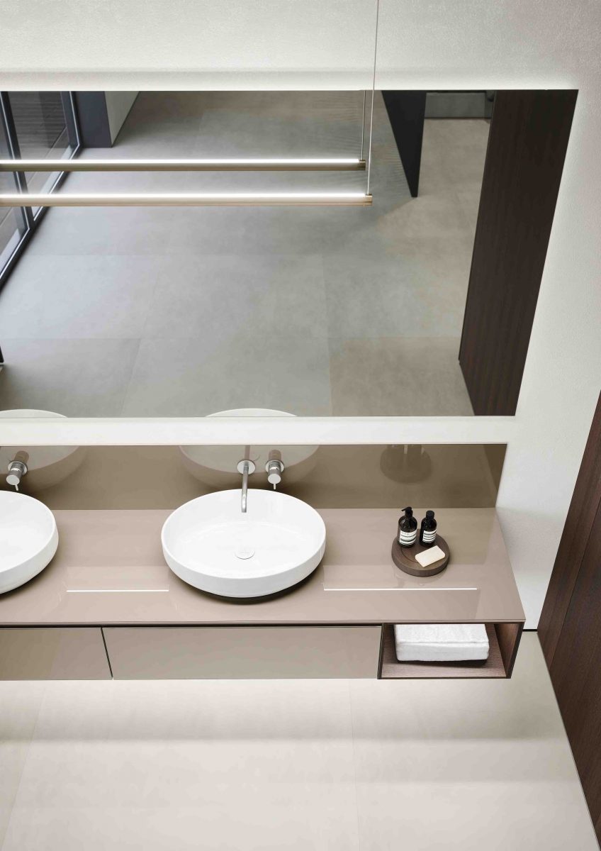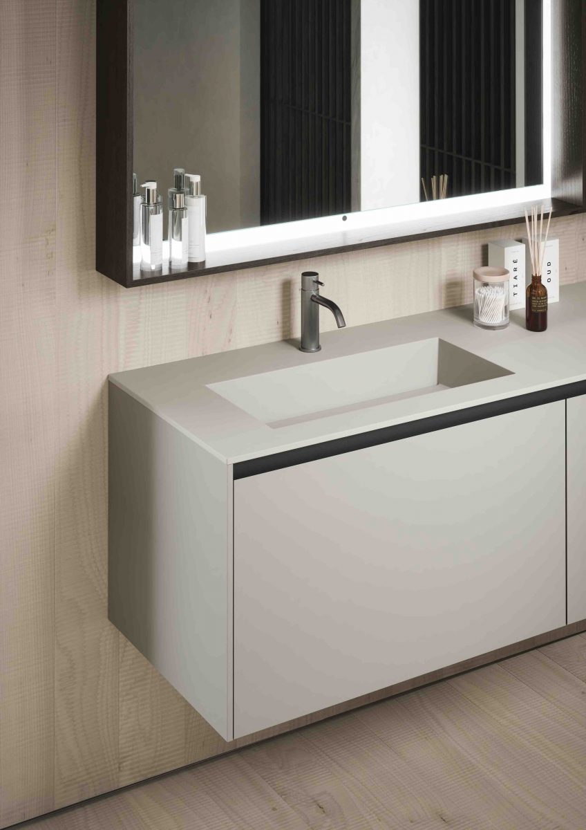 I lavabi integrati sono di varie forme e materiali: Purefeel, Geacril, Corian, marmo, Gres porcellanato e vetro. La collezione è realizzata in dimensioni che garantiscono un uso ottimale dello spazio all’interno del bagno. Oltre ai mobili lavabo, la gamma completa comprende pensili, colonne, boiserie e specchi pensati per creare un ambiente coerente e sofisticato.