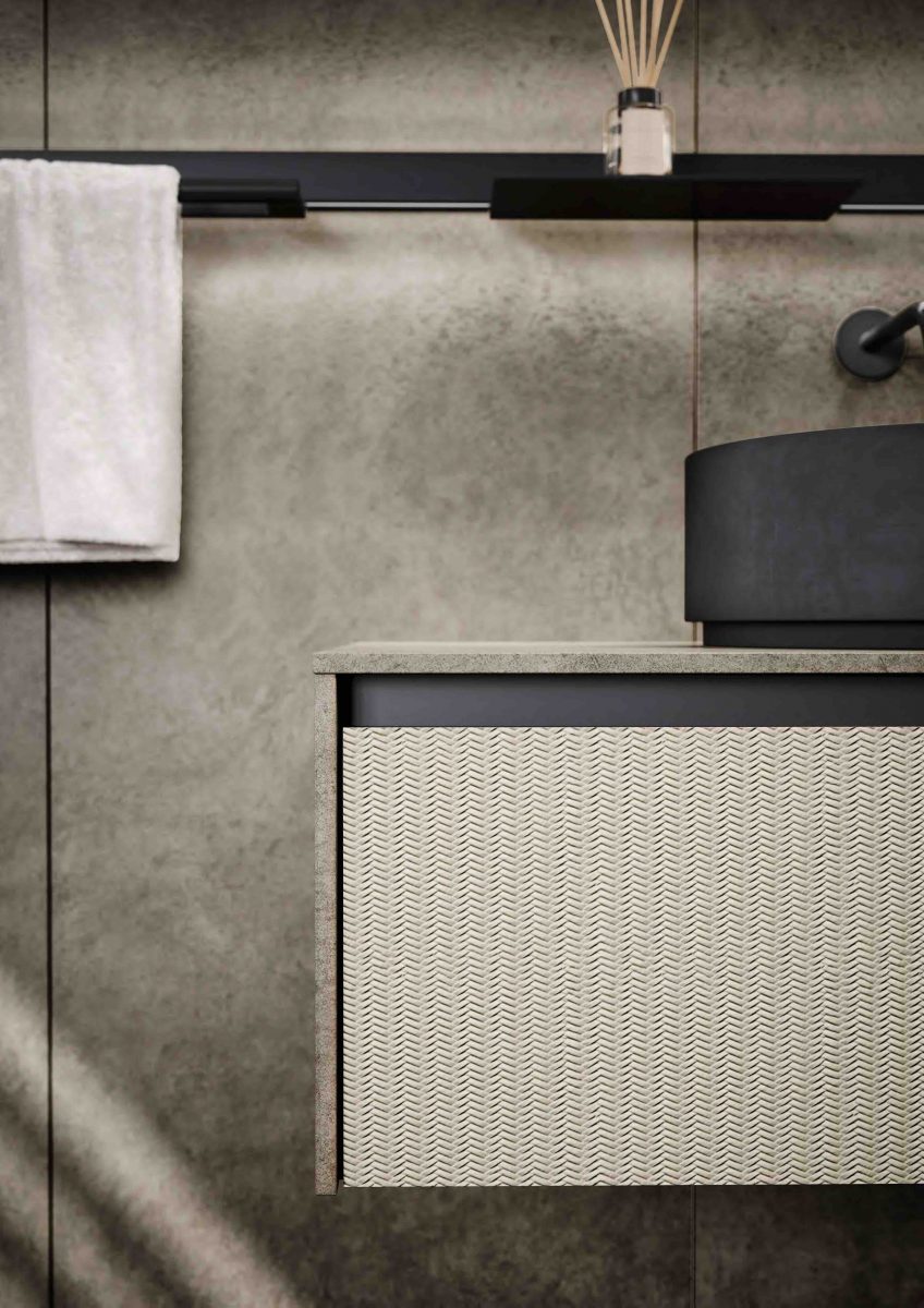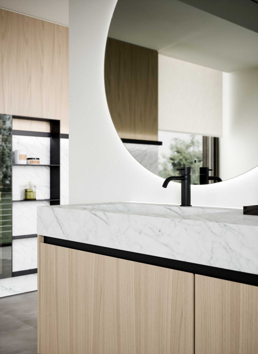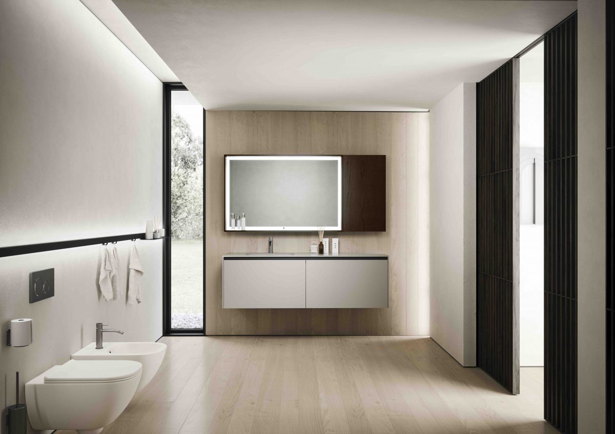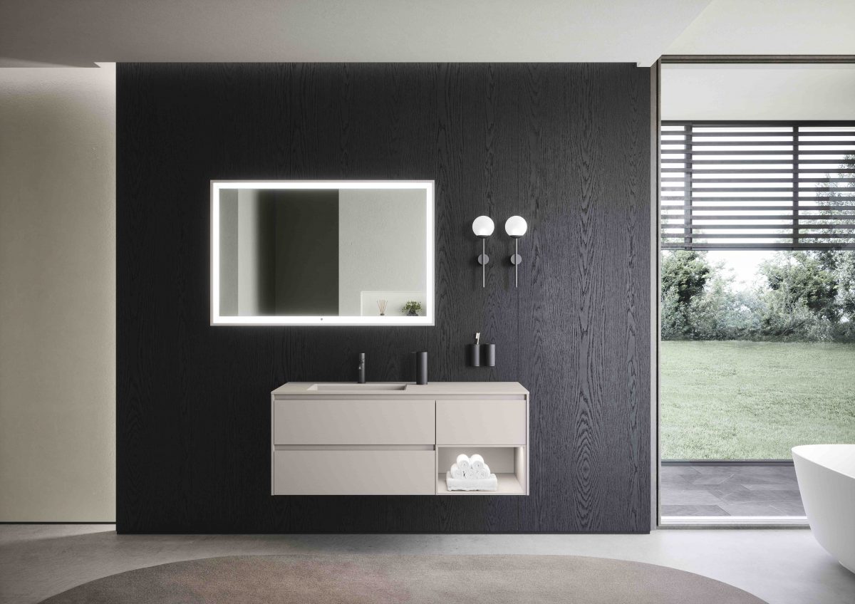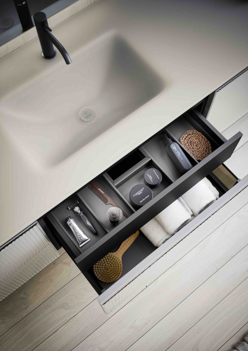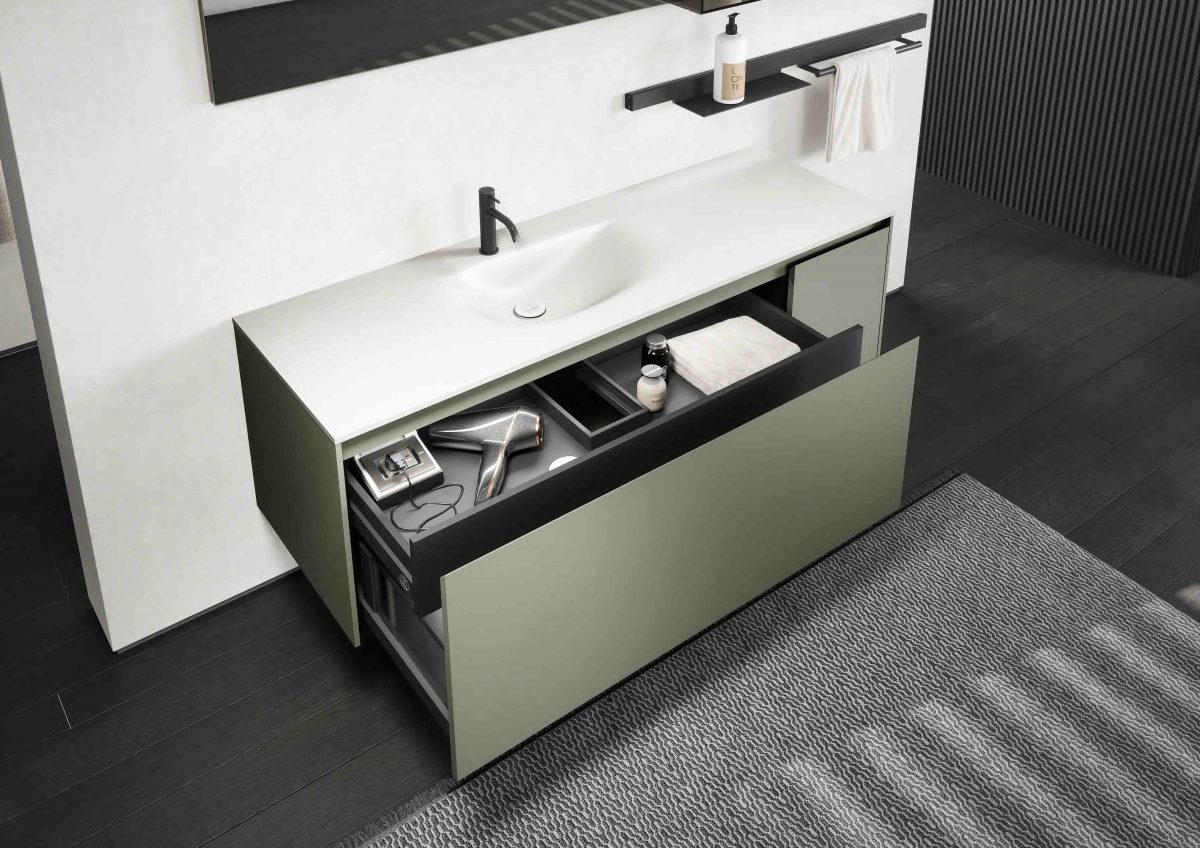 I lavabi integrati sono di varie forme e materiali: Purefeel, Geacril, Corian, marmo, Gres porcellanato e vetro. La collezione è realizzata in dimensioni che garantiscono un uso ottimale dello spazio all’interno del bagno. Oltre ai mobili lavabo, la gamma completa comprende pensili, colonne, boiserie e specchi pensati per creare un ambiente coerente e sofisticato.