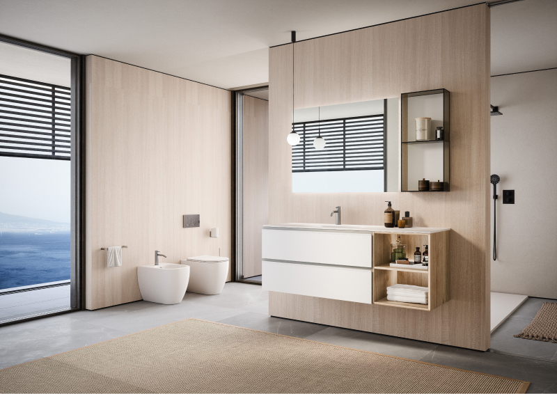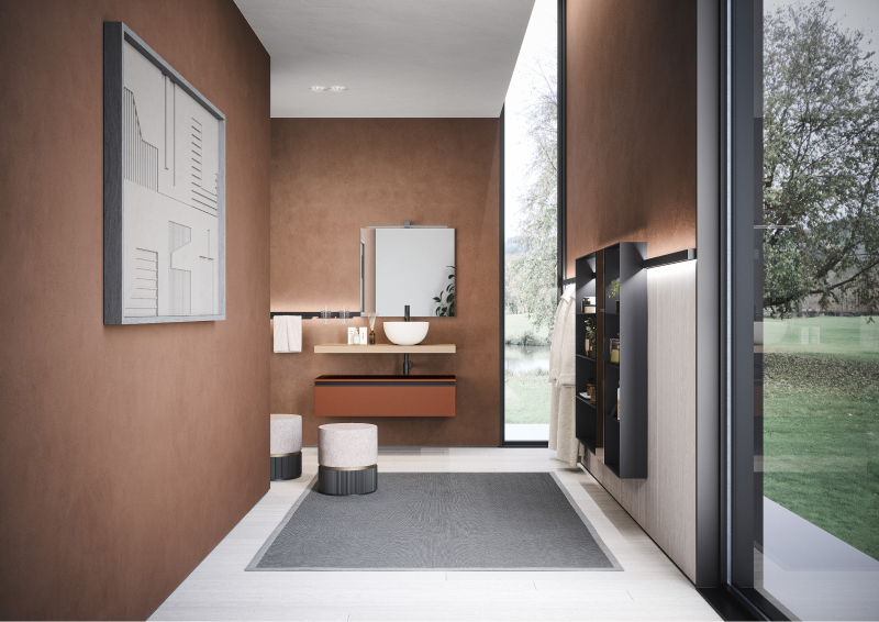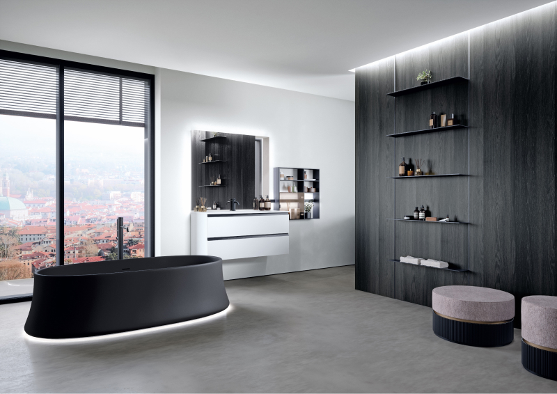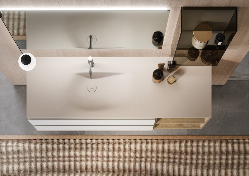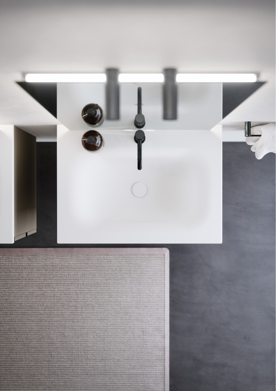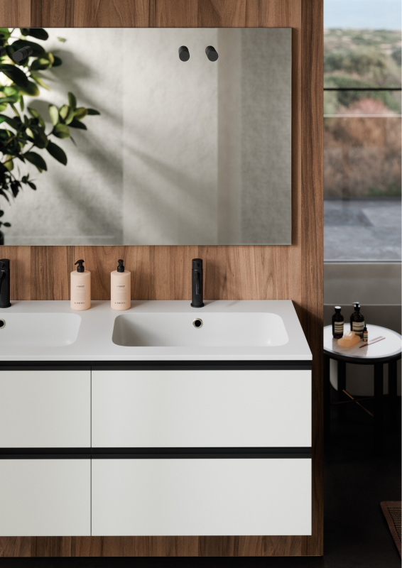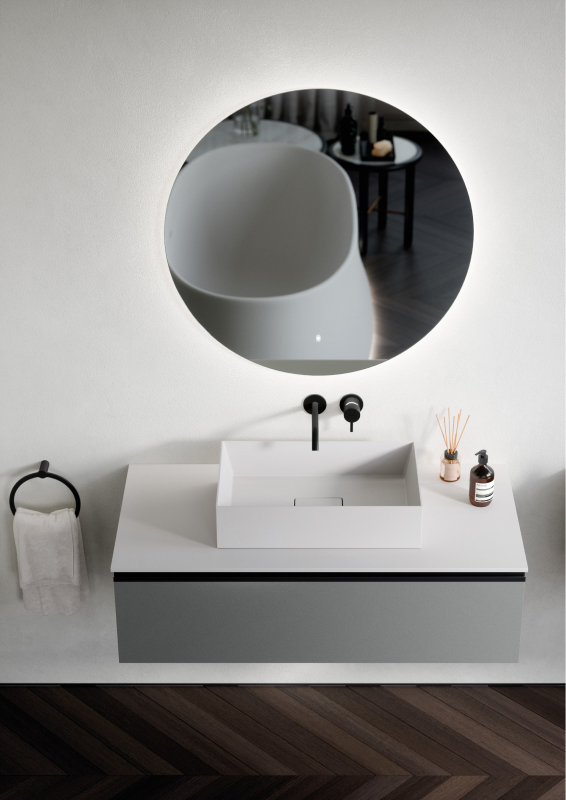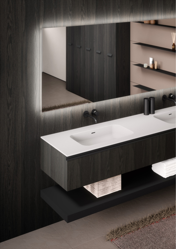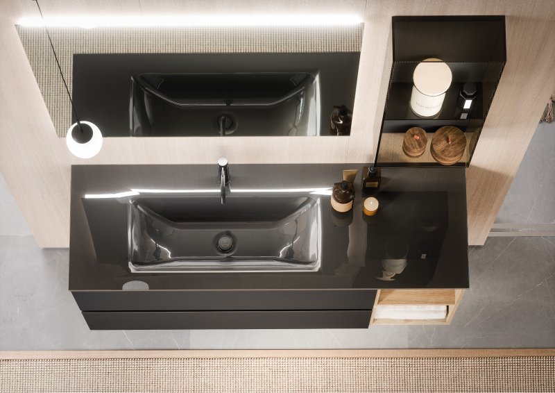 washbasins are available in ceramic, white resin or glass, integrated and back-painted glass
