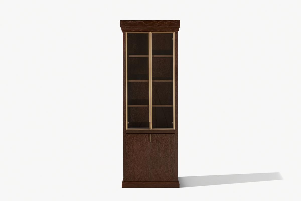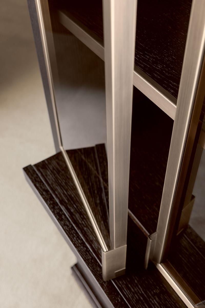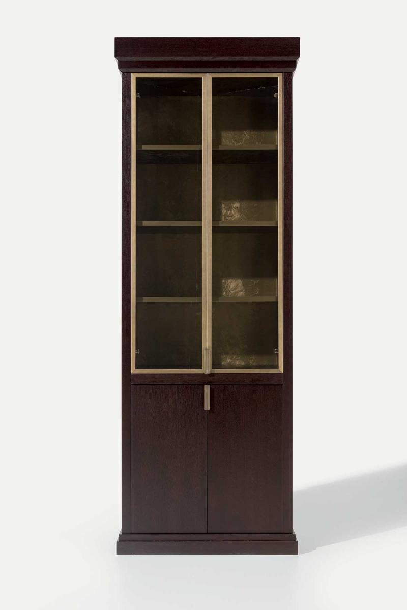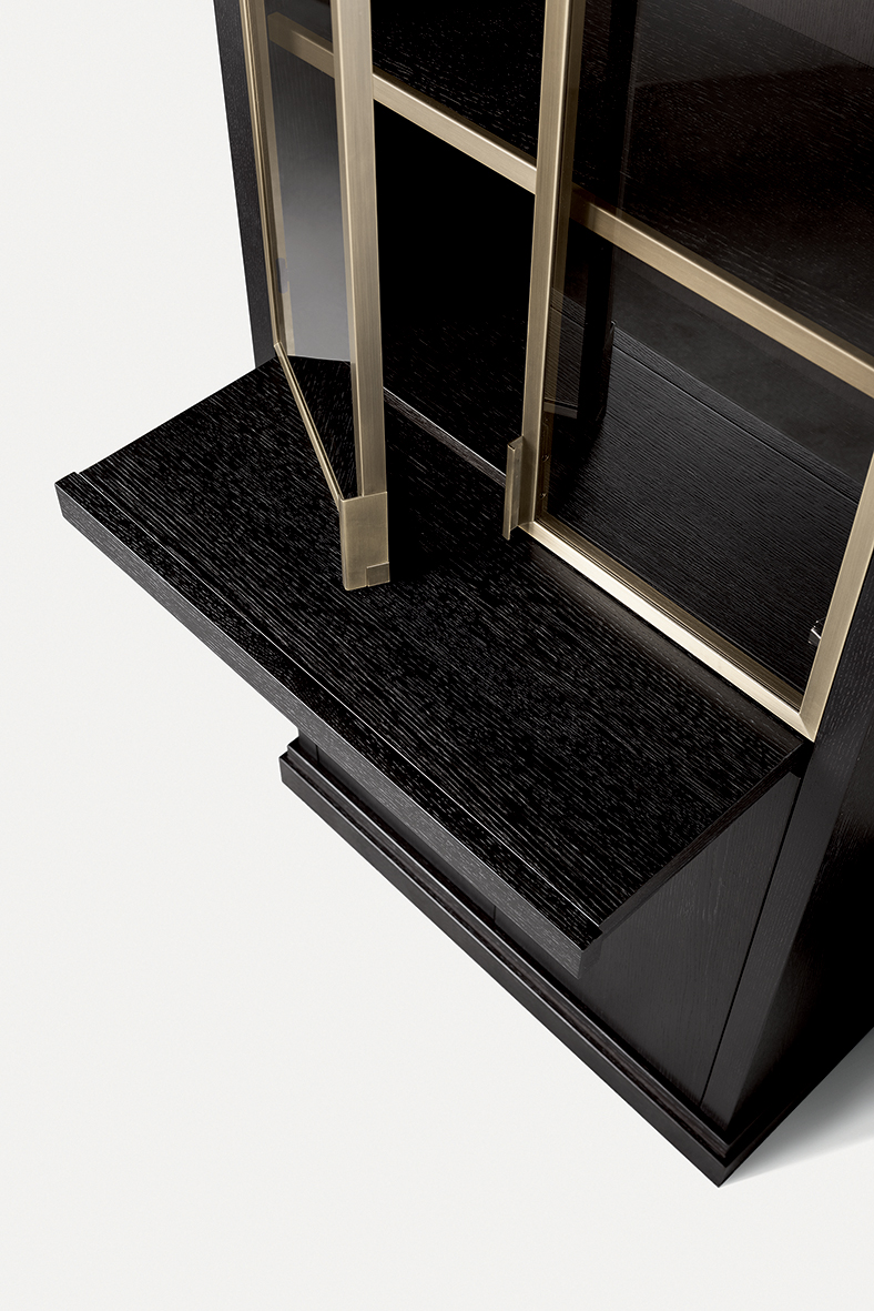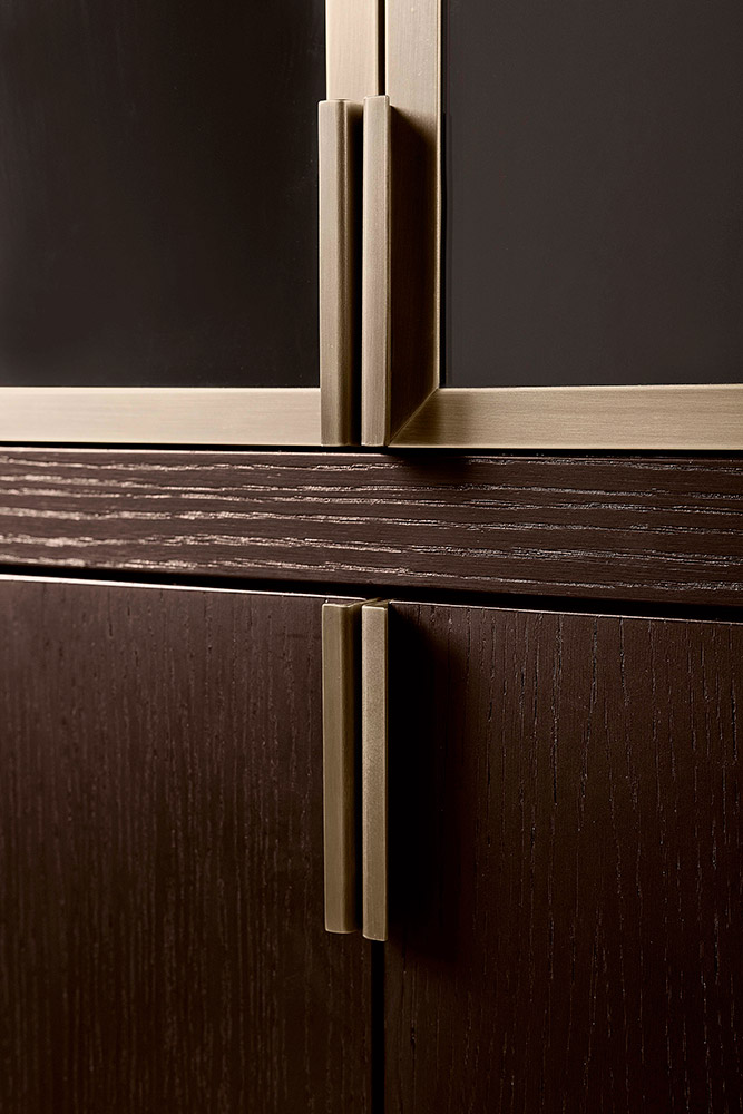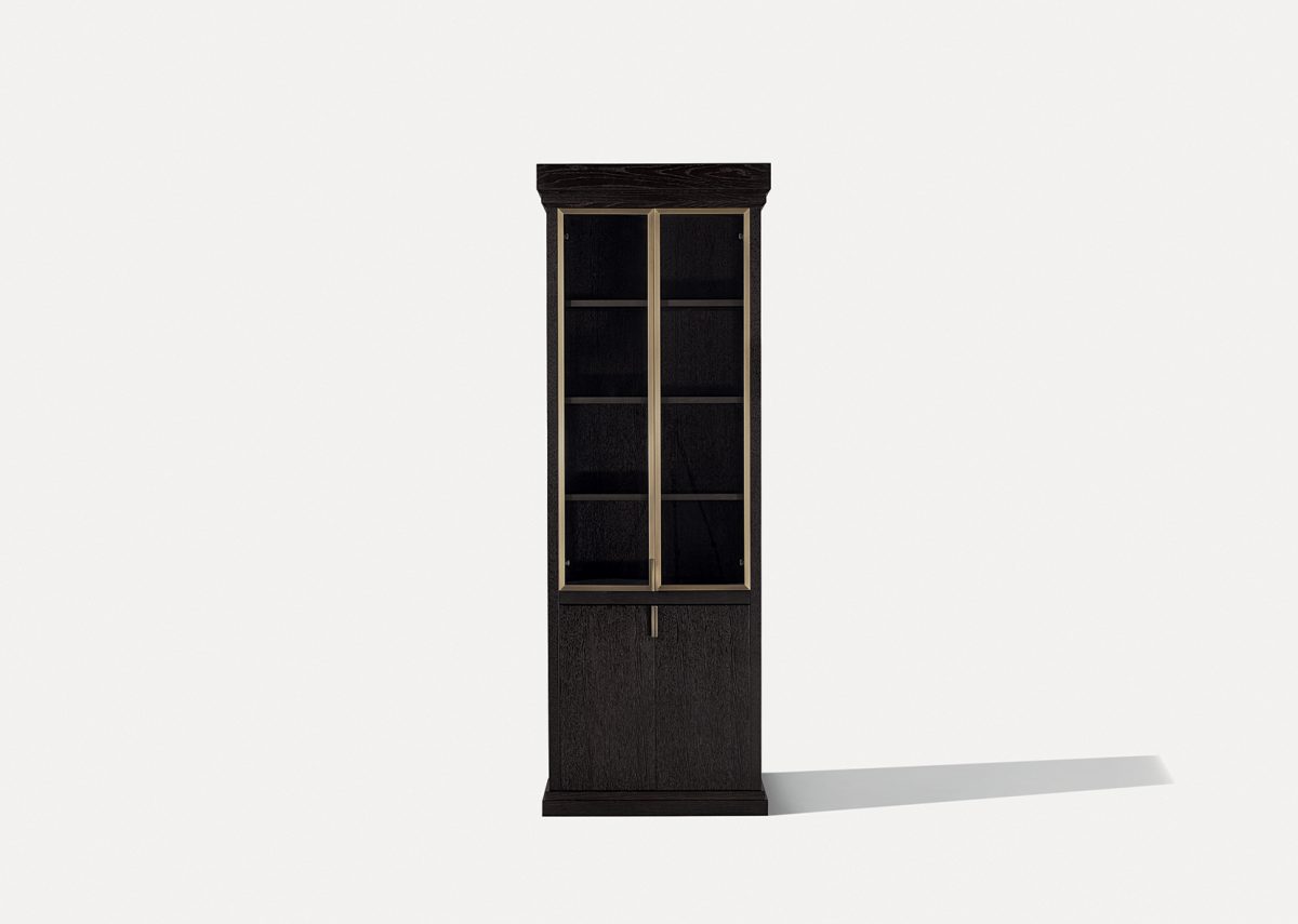 Mobile vetrina con cappello e fondo della struttura realizzate con cornici in legno massello di rovere di prima scelta privo di nodi. Le spalle sono formate da pannelli in particelle di legno rivestito in legno di rovere di prima scelta per le versioni in essenza e da pannelli in carta melaminica da laccare per le versioni laccate. La schiena e la struttura interna sono composte da un pannello in particelle di legno rivestito con tranciati di rovere di prima scelta per le versioni in essenza, in carta melamminica da laccare per le versioni laccate. Le ante sono in vetro fumè temperato formate da un telaio leggero in alluminio con maniglia incassata, il tutto in finitura bronzata. Le ante in legno sono composte da un pannello in particelle di legno rivestito con tranciati di rovere di prima scelta per le versioni in essenza, con carta melaminica da laccare per le versioni laccate. La maniglia è in acciaio in finitura bronzata. Il mobile si compone di un cassetto con frontale composto da un pannello in particelle di legno rivestito con tranciati in legno di rovere di prima scelta per le versioni in essenza, in carta melaminica da laccare per le versioni laccate.