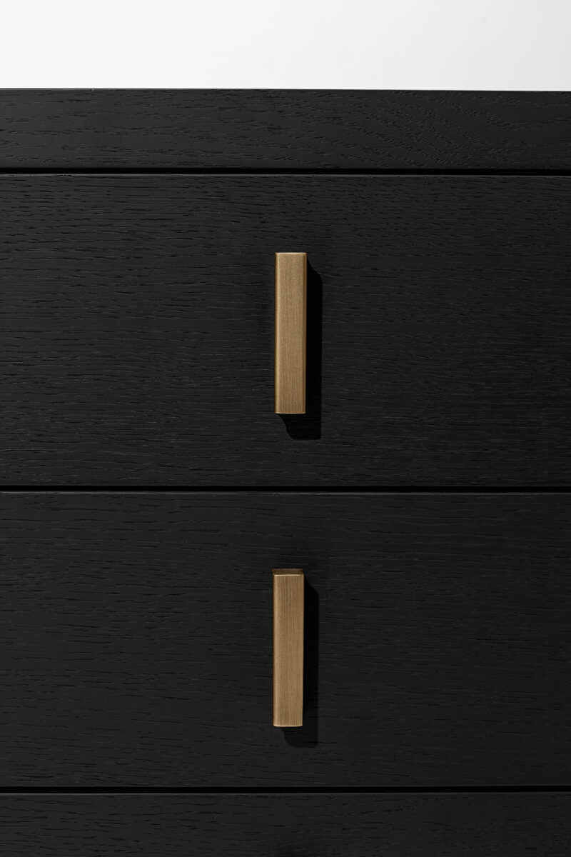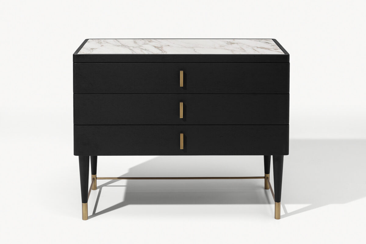 Комод Mozart с тремя ящиками. Корпус доступен в отделке из дерева, с глянцевым или матовым лаковым покрытием. Столешница из мрамора предлагается в разных вариантах отделки. Металлическое основание выполнено в отделке «бронза».