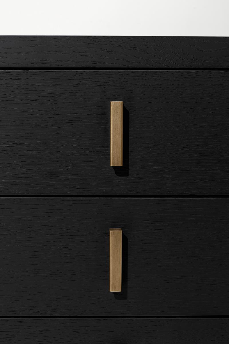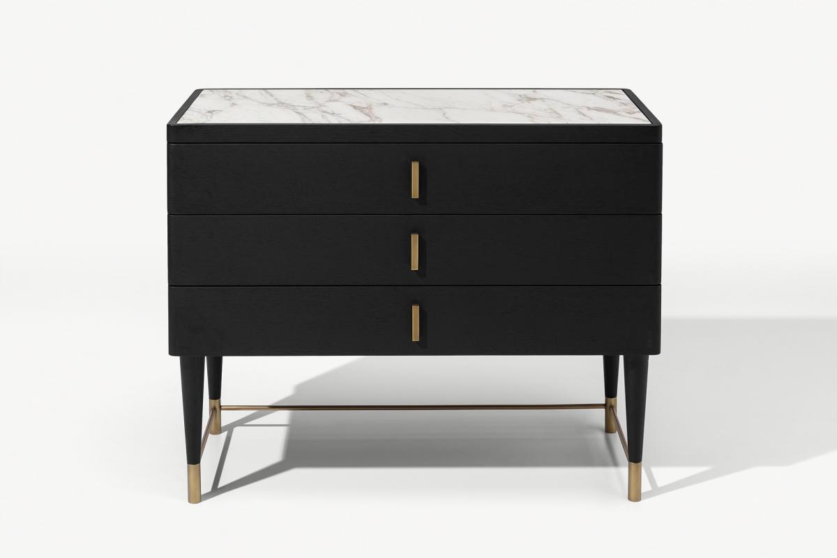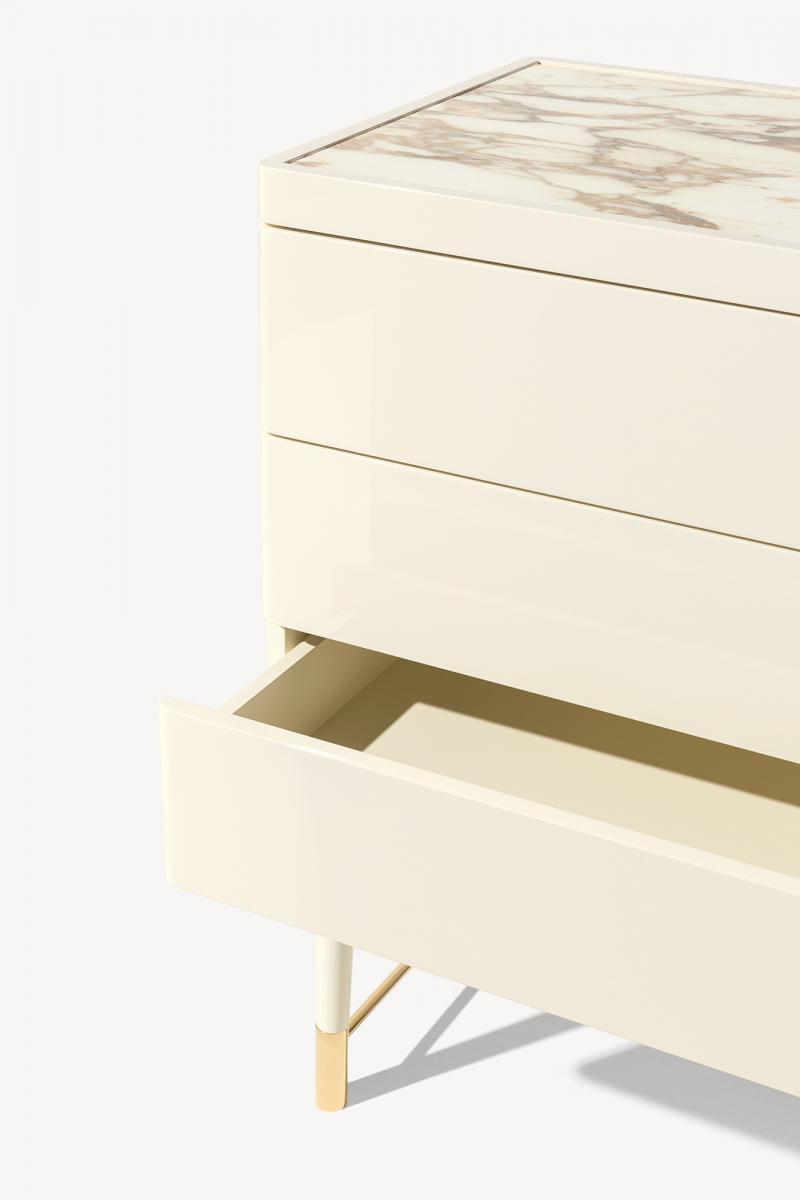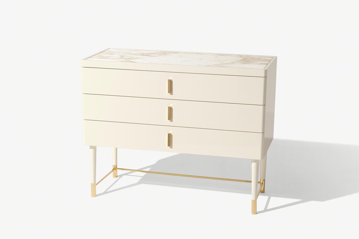 Rectangular Mozart Chest of drawers with three drawers. The structure is available in wood, gloss lacquer or matt lacquer finishes. Marble top is available in different finishes. The metal frame come in bronze finish.