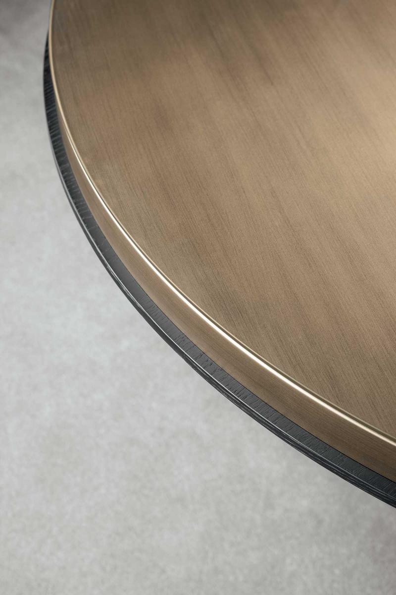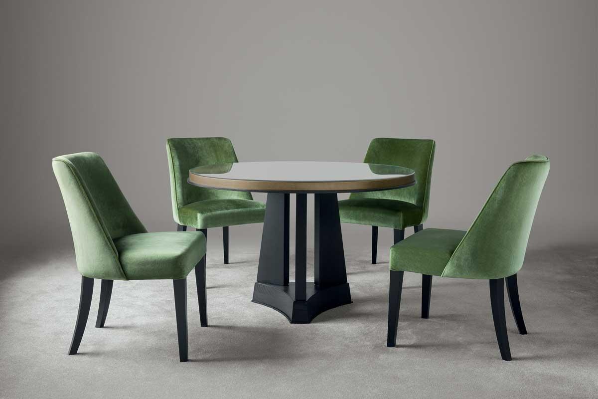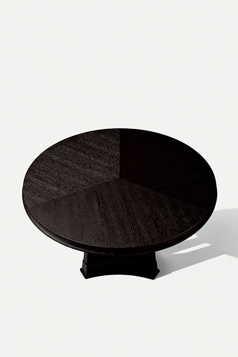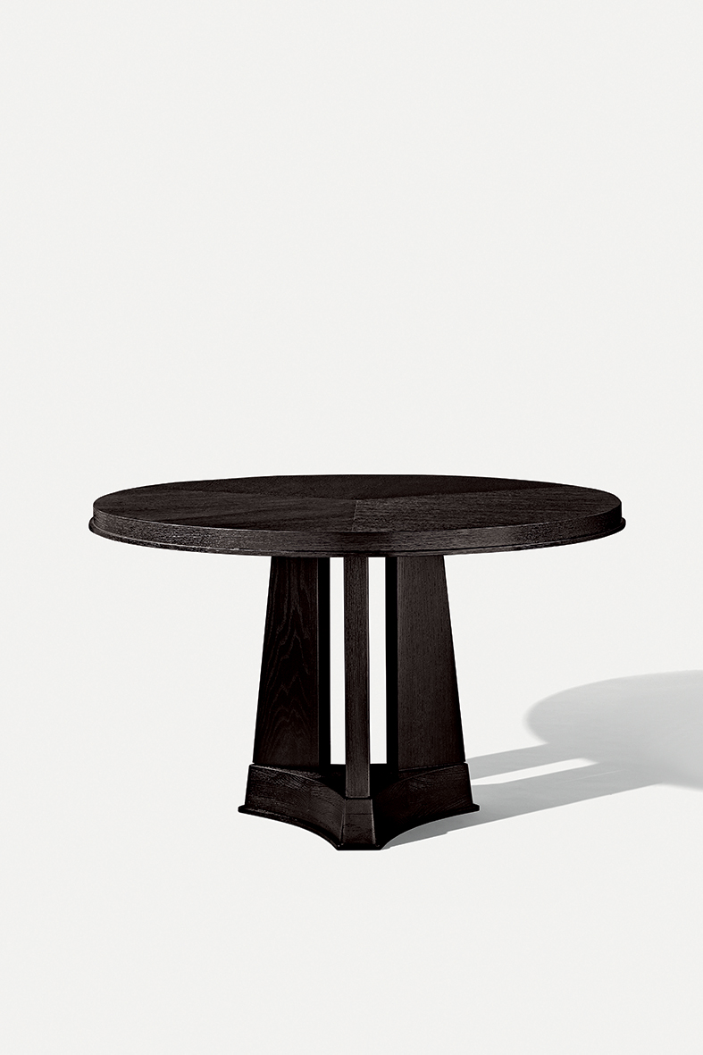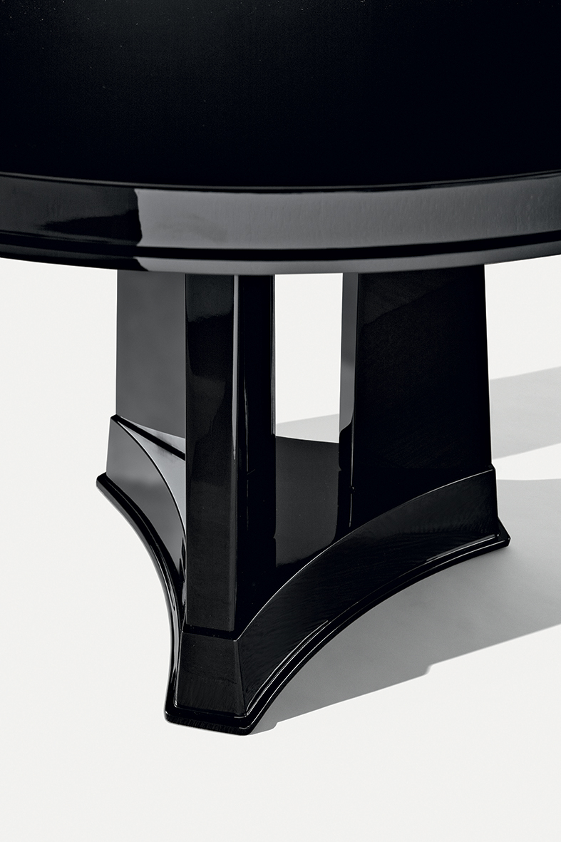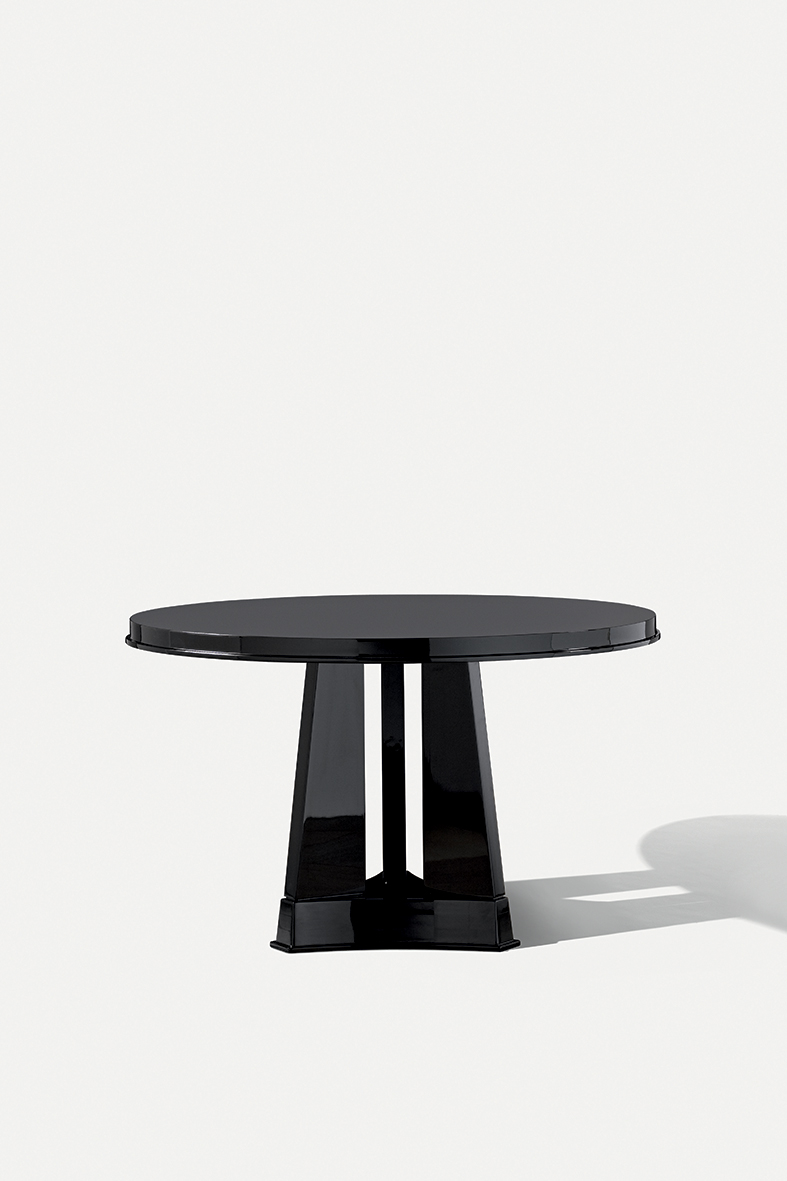 Tavolo rotondo caratterizzato da una modanatura che ne sottolinea la geometria Art Dèco. Il piano è composto da un pannello di particelle di legno da 5 cm di spessore impiallacciato e bordato con tranciati di rovere nella versione in essenza. Nella versione laccata il top è rivestito da carta melaminica da laccare a cui viene applicato un top in vetro laccato. Il basamento è composto interamente da masselli di rovere nella versione in essenza; nella versione laccata vengono utilizzati masselli di toulipier da laccare. È disponibile in 2 dimensioni.