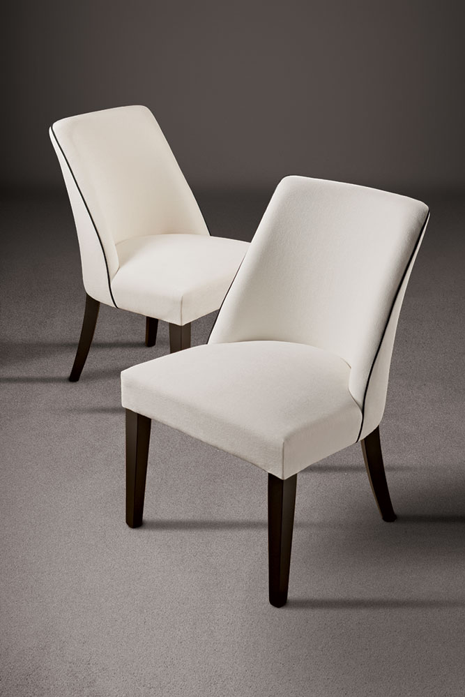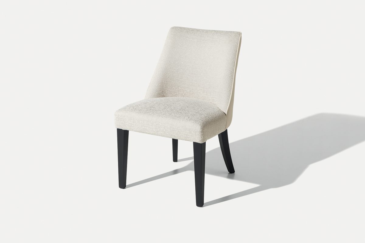 Bequemer gepolsterter Schalenstuhl, erhältlich auch mit Armlehnen. Der Korpus besteht aus massivem Buchenholz mit Schichtholzplatten. Die Beine sind aus massivem Buchenholz und in allen Ausführungen mit Holzoberflächen und lackierten Ausführungen erhältlich. Die Sitzfläche und die Rückenlehne bestehen aus weichem PUR-Schaumstoff der von elastischen Gurten gehalten wird. Das Sitzpolster besteht aus einer Basis aus PUR-Schaumstoff in drei verschiedenen Dichten. Mit einem Stoff- oder Lederbezug erhältlich; der Bezug ist nicht abnehmbar.