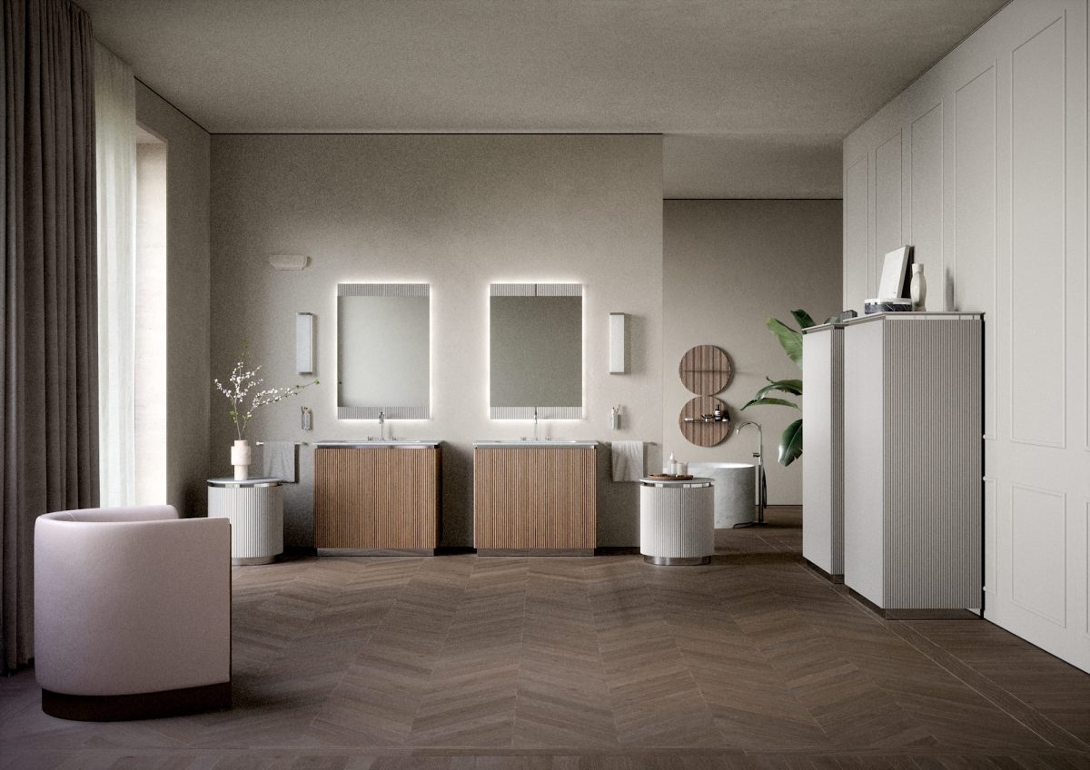 С коллекцией Nàos ванная комната становится нечто большим, чем просто функциональным пространством. Комната превращается в место красоты и созерцания. Классическая эстетика сливается с современностью, создавая ни с чем несравнимые впечатления. В основе этой коллекции лежит туалетный столик — воплощение функциональности и красоты в исполнении из орехового дерева. Материал окутывает теплом и приближает к природе. Лакированная версия погружает в эстетику современности. Туалетный столик Nàos отличается вниманием к деталям и отсылает к мастерству итальянских ремесленников.