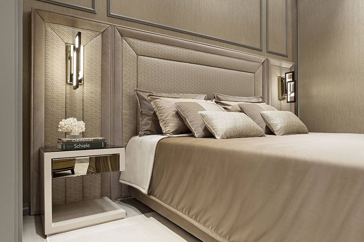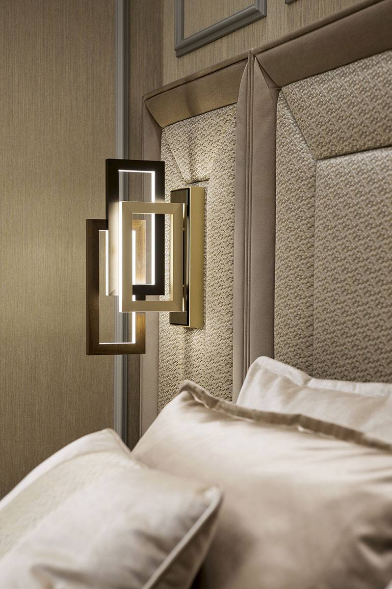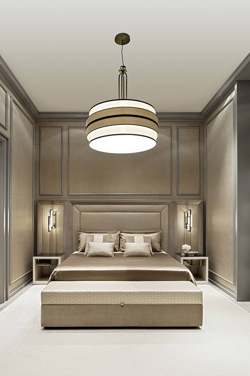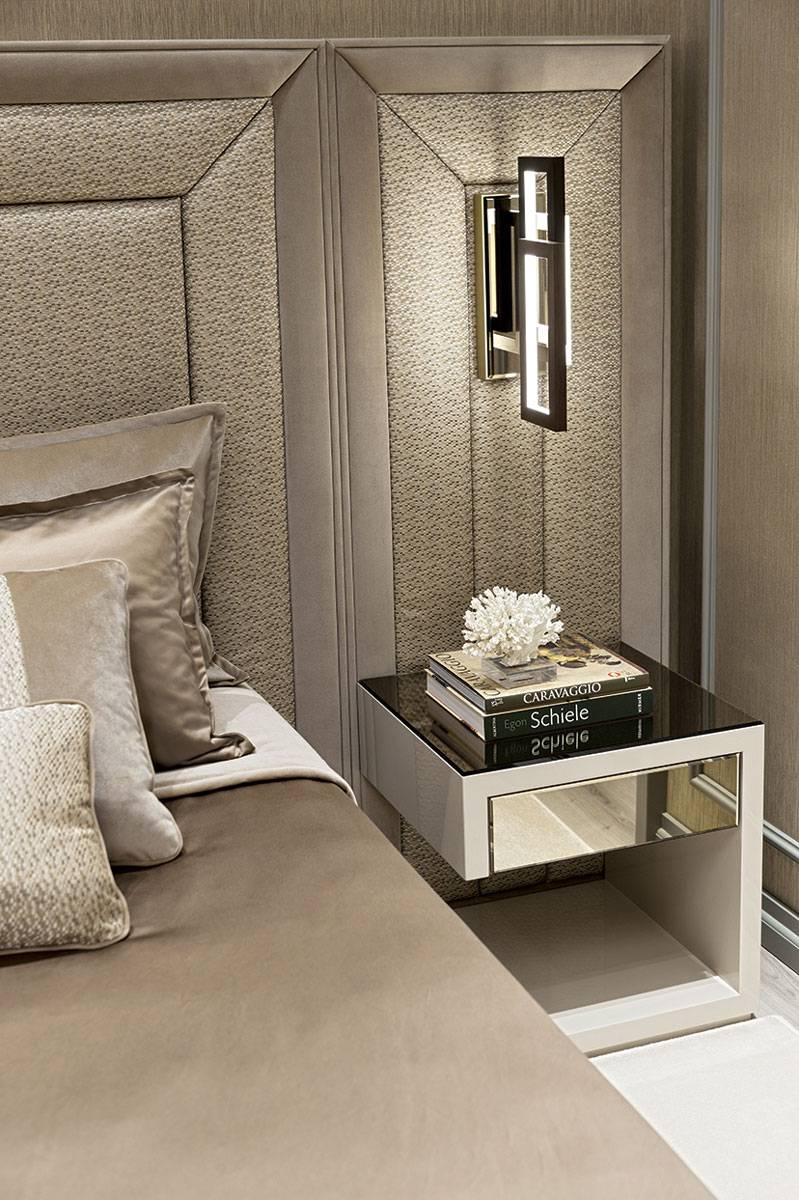 Спальная комната и зона ванной представляют собой единое пространство, предназначенное для релаксации и комфорта благодаря коллекции мебели для ванных комнат Academy из серии Luxury, где утонченная элегантность черпает вдохновение в купальнях salle de bain, выполненных в стиле ар-деко. Коллекция Academy включает в себя также сантехнические изделия, ванну c панелями, а также все аксессуары, которые завершают убранство. В представляемой модели используется «канелюрный» фасад в отделке из черного блестящего лака и золота.
