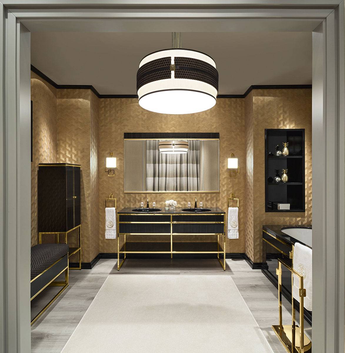 La chambre à coucher et la salle de bain crée une unique ambiance dédié au repos et au bienêtre grâce à la série Academy de la collection Bathroom Luxury. Raffinée et élégante, inspirée aux salles de bain de style Art Déco, la série Academy comprends tous les sanitaires, la baignoire revêtue et tous les accessoires qui complètent l’ameublement. Pour cette version, le revêtement est cannelé avec une finition en laqué noir et des détails dorés.
