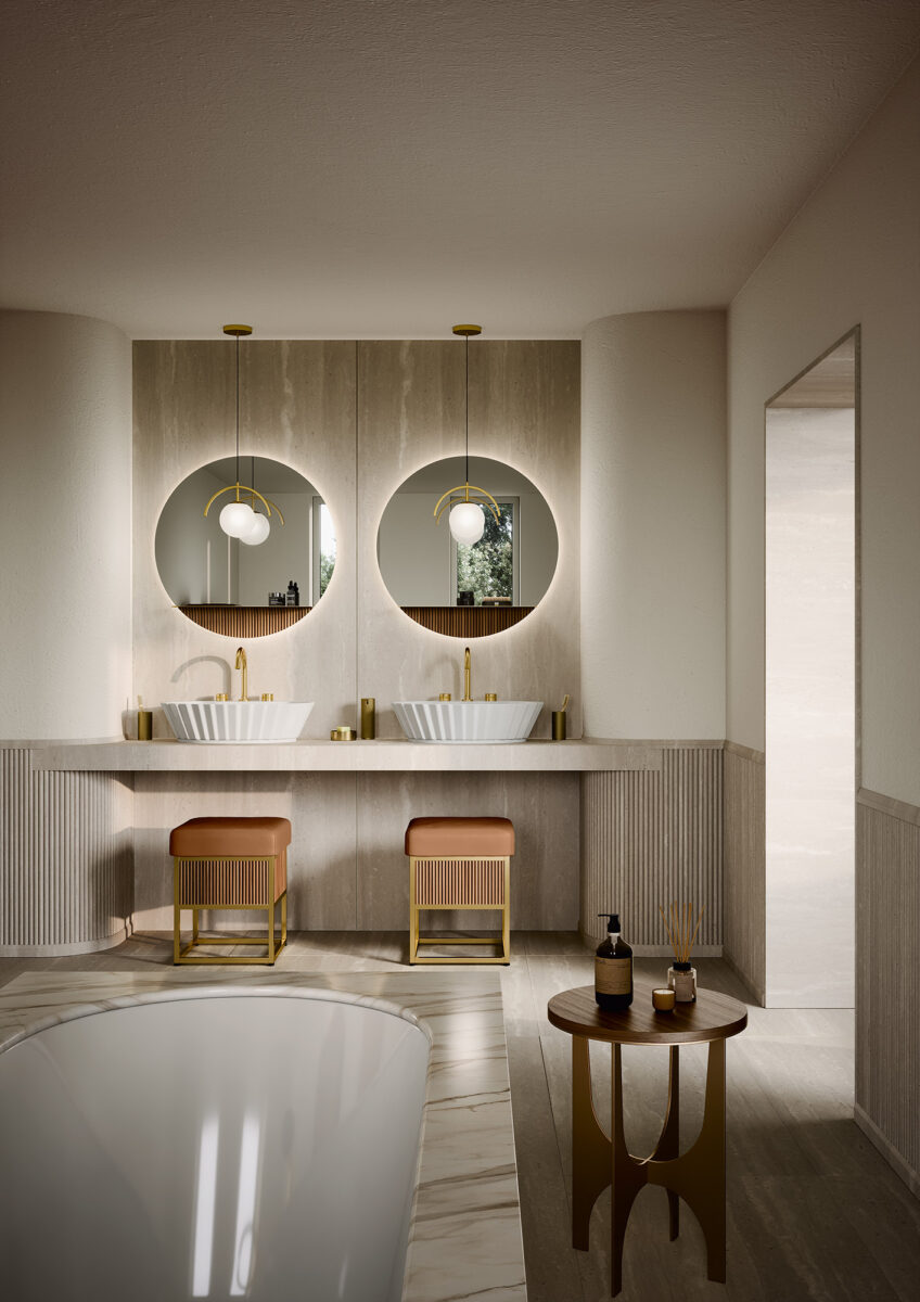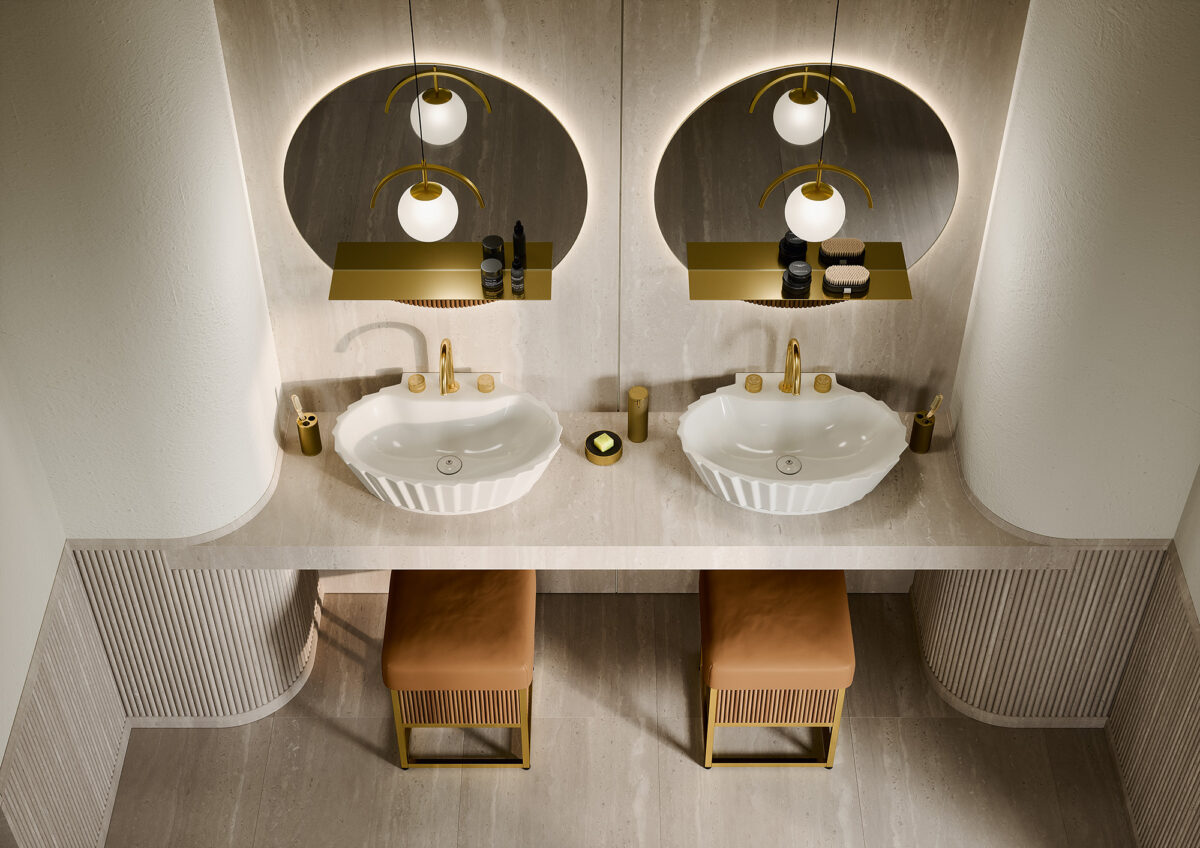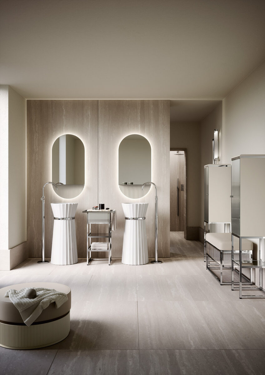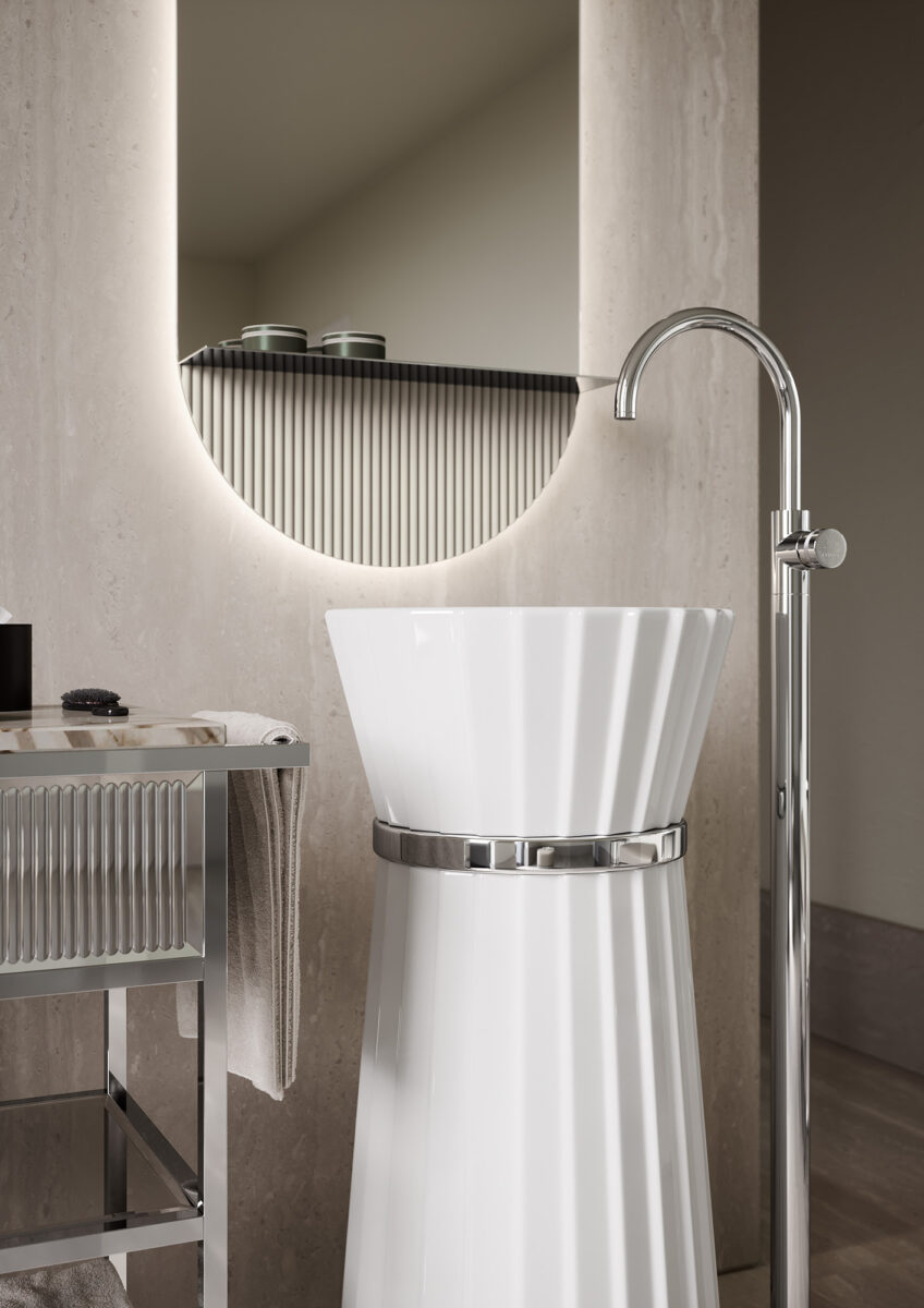 Колонна-раковина Plissé выглядит элегантно и роскошно благодаря складкам, которые похожи на складки ткани: они придают объём и создают ощущение лёгкого движения. Раковина Plissé, изготовленная из глянцевой белой керамики, украшена кольцом из золота или хромированного металла, подчёркивающим «талию», как в изделиях высокой моды. Благодаря своей сдержанной, но утончённой элегантности, она идеально вписывается в роскошные интерьеры, созданные по строгим проектам с особым вниманием к деталям архитектуры и дизайна.