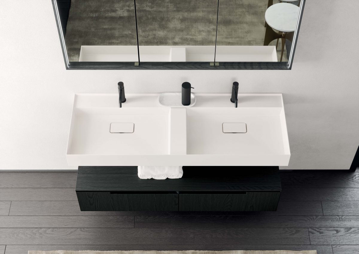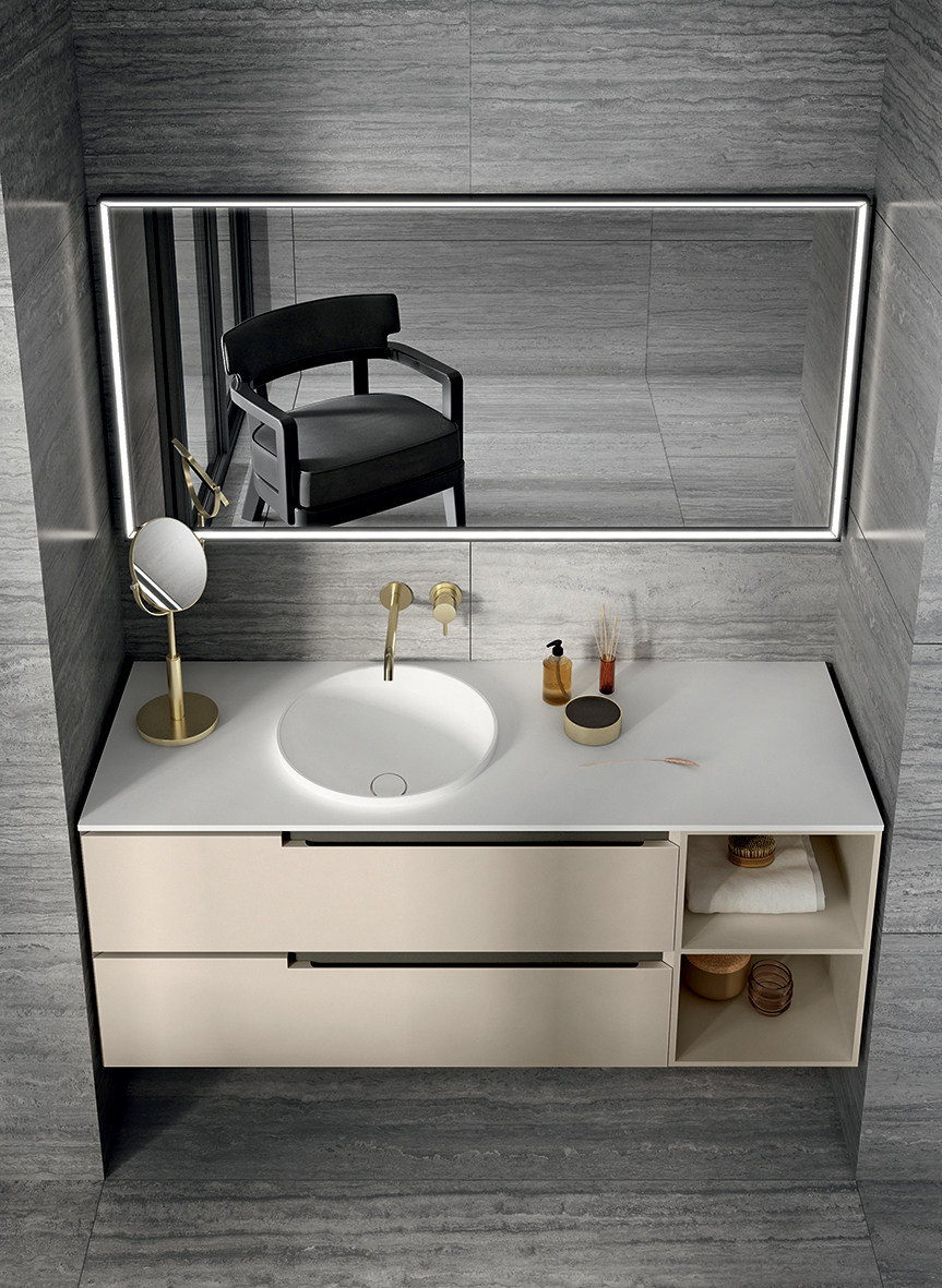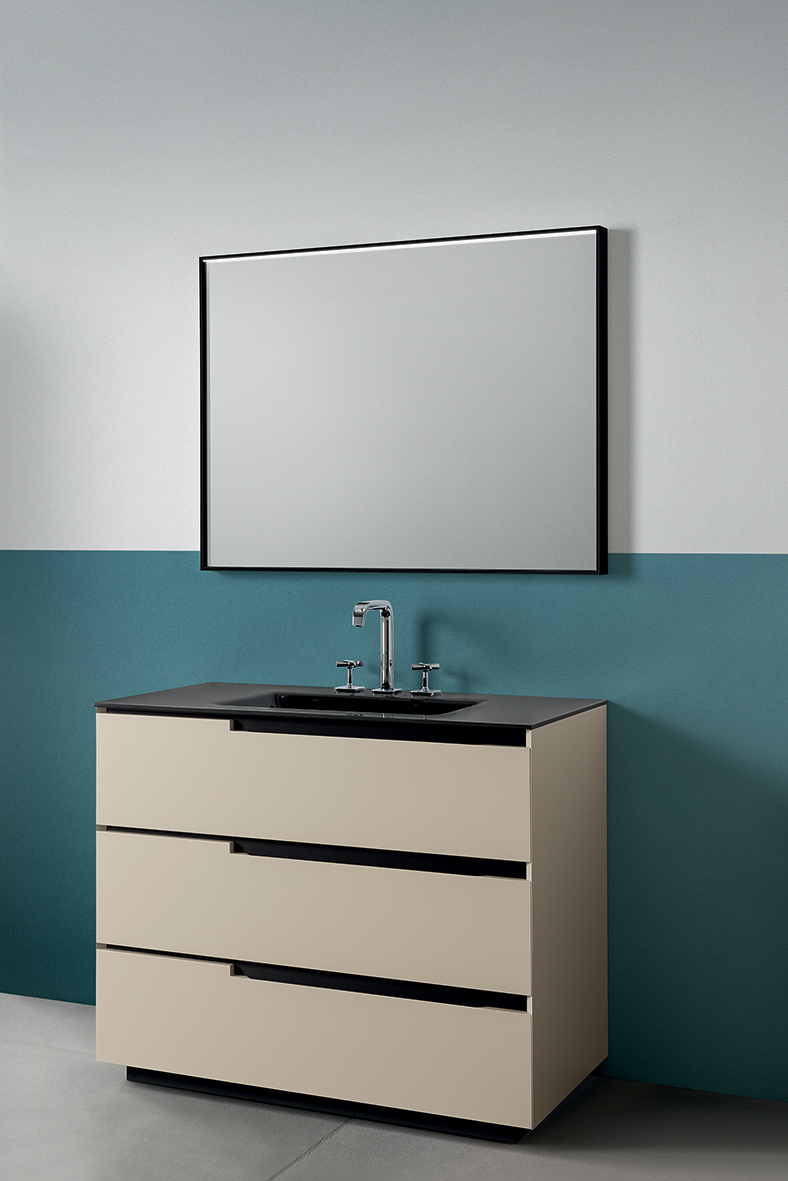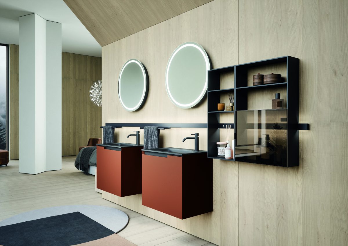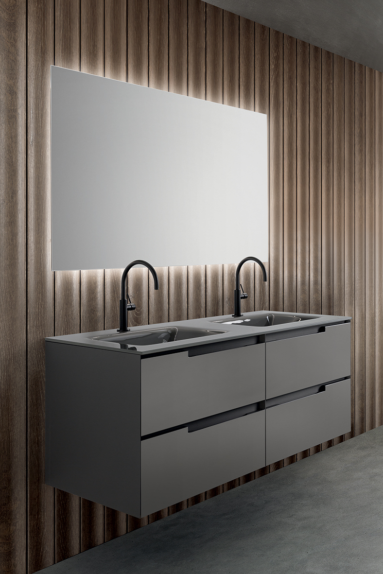 Three projections are available, as well as endless configurational possibilities. There is a wide selection of basins not to mention an extensive choice of lacquer and wood veneer finishes. Complementary items include contemporary taps, new mirrors complete with back-lighting and bathtubs in a variety of shapes and materials.
