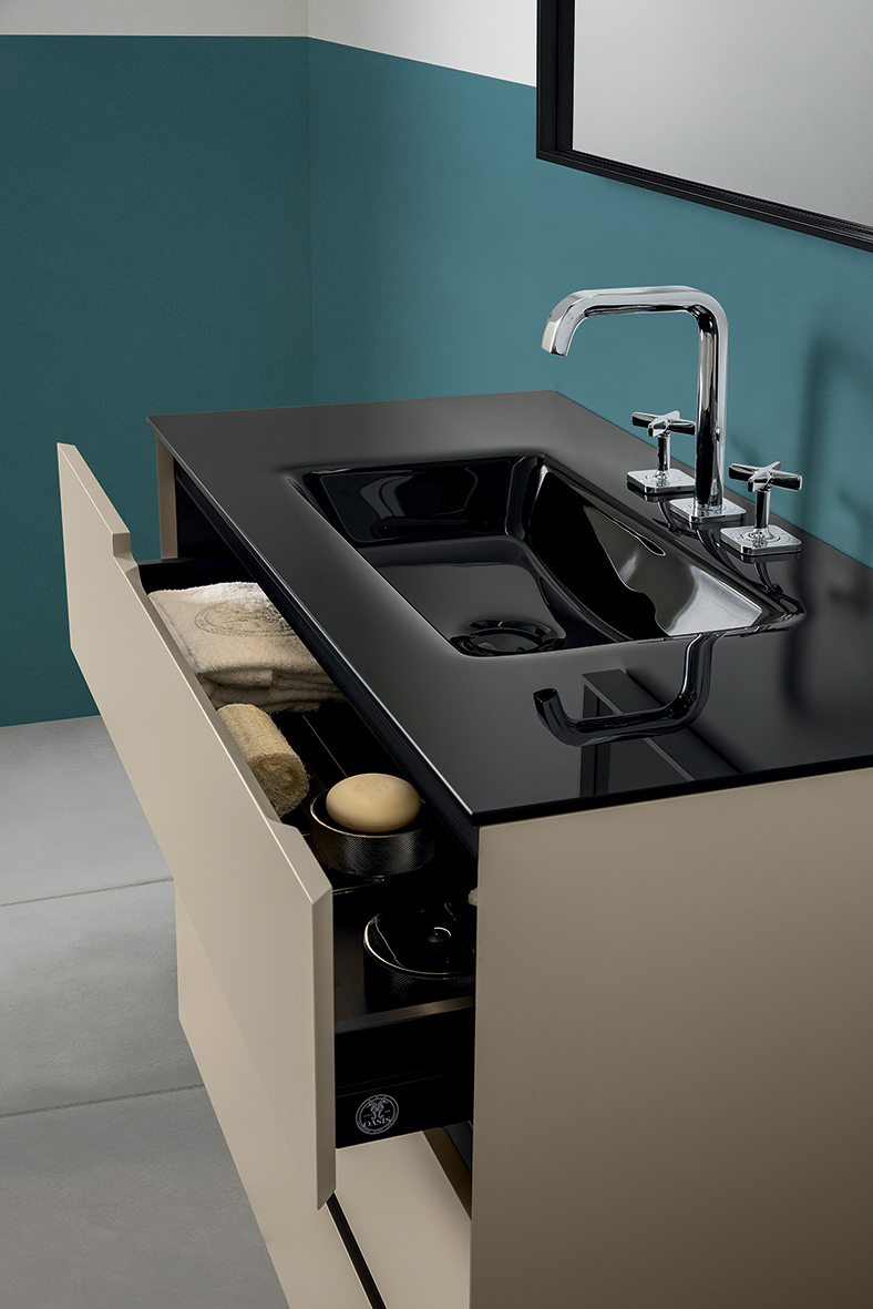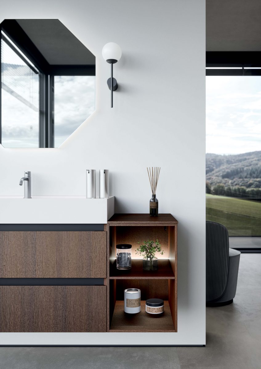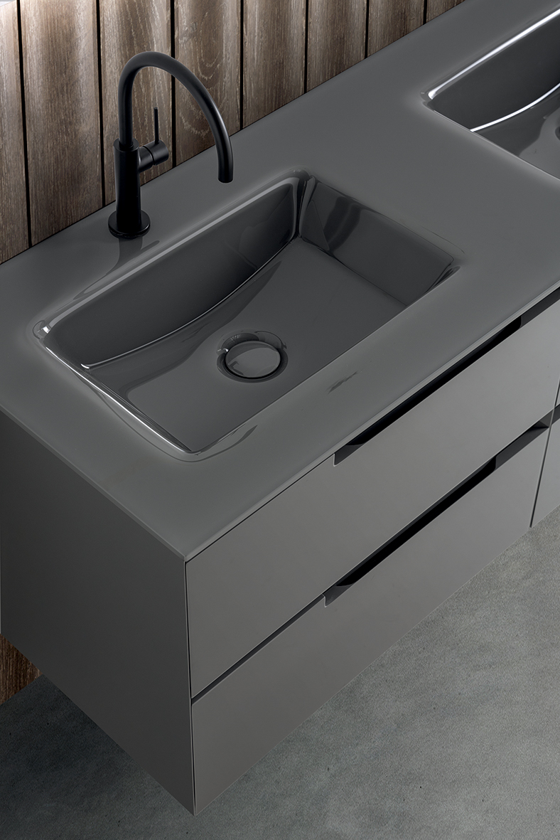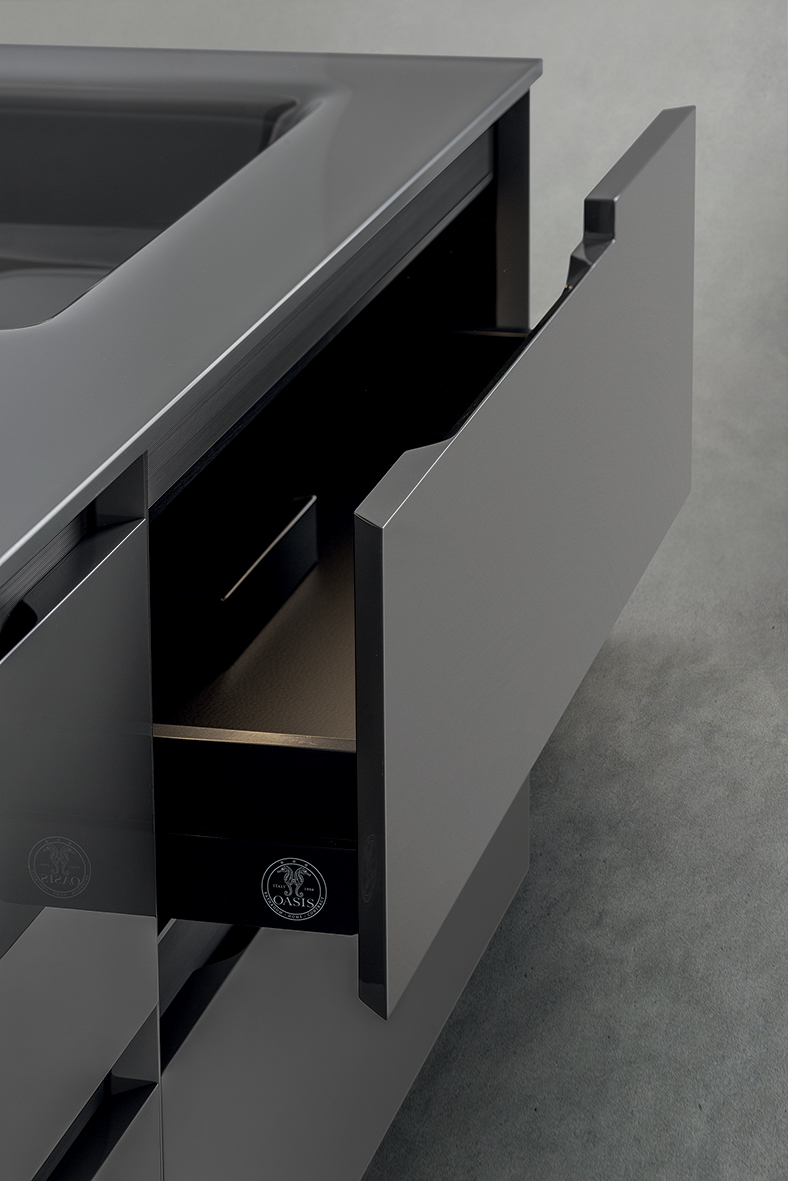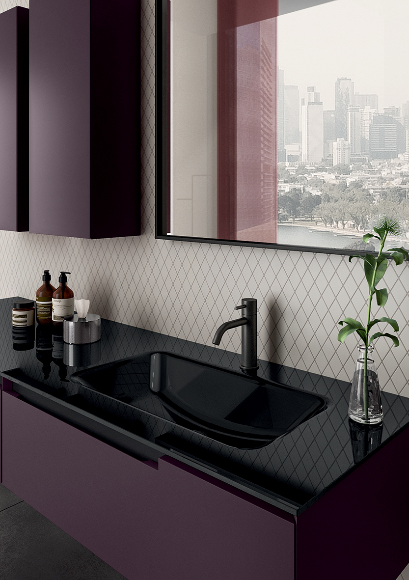 Three projections are available, as well as endless configurational possibilities. There is a wide selection of basins not to mention an extensive choice of lacquer and wood veneer finishes. Complementary items include contemporary taps, new mirrors complete with back-lighting and bathtubs in a variety of shapes and materials.