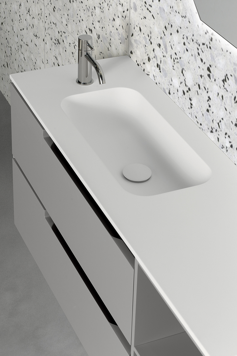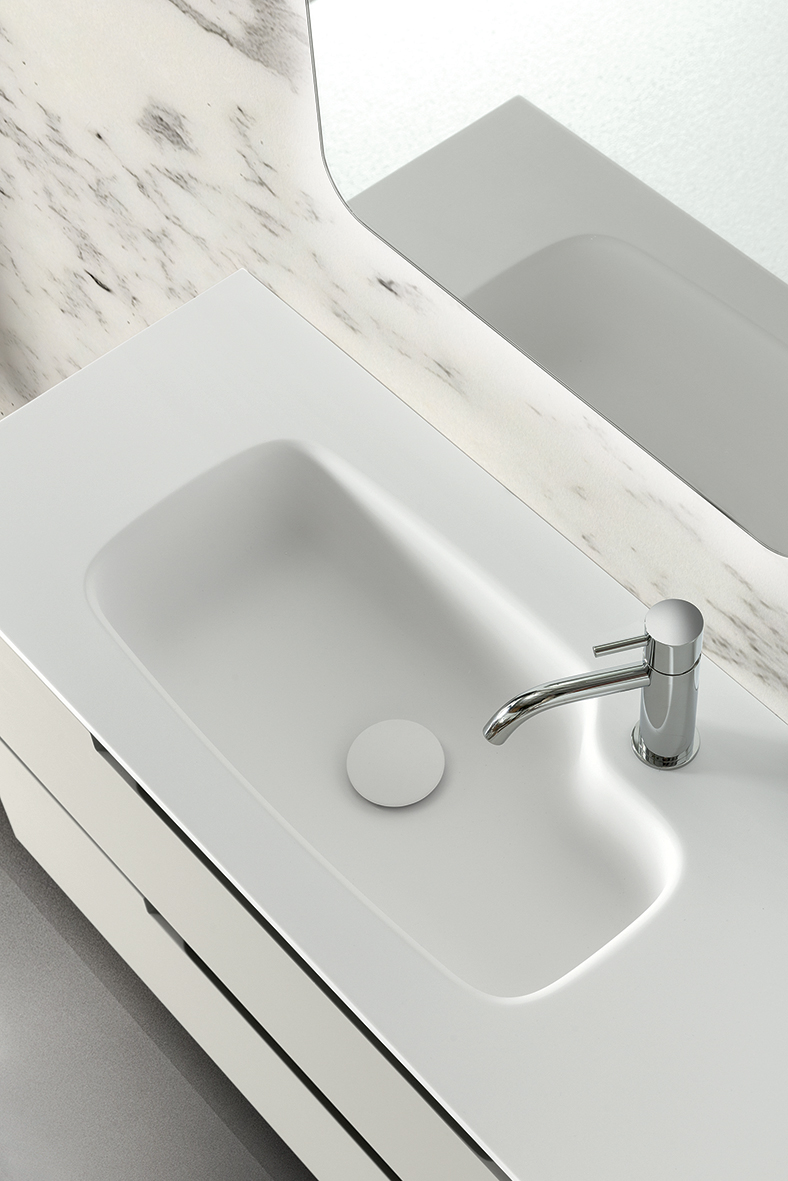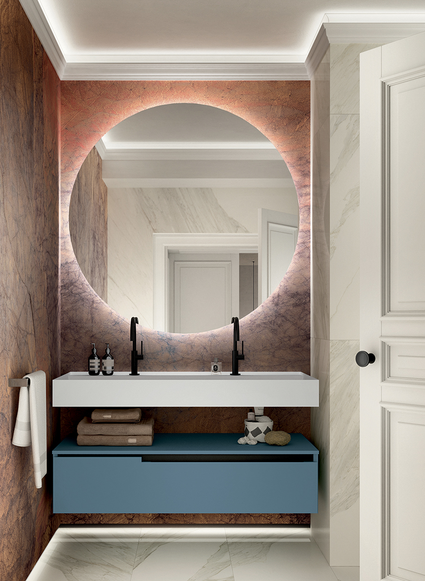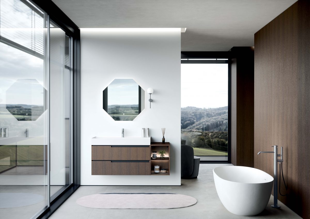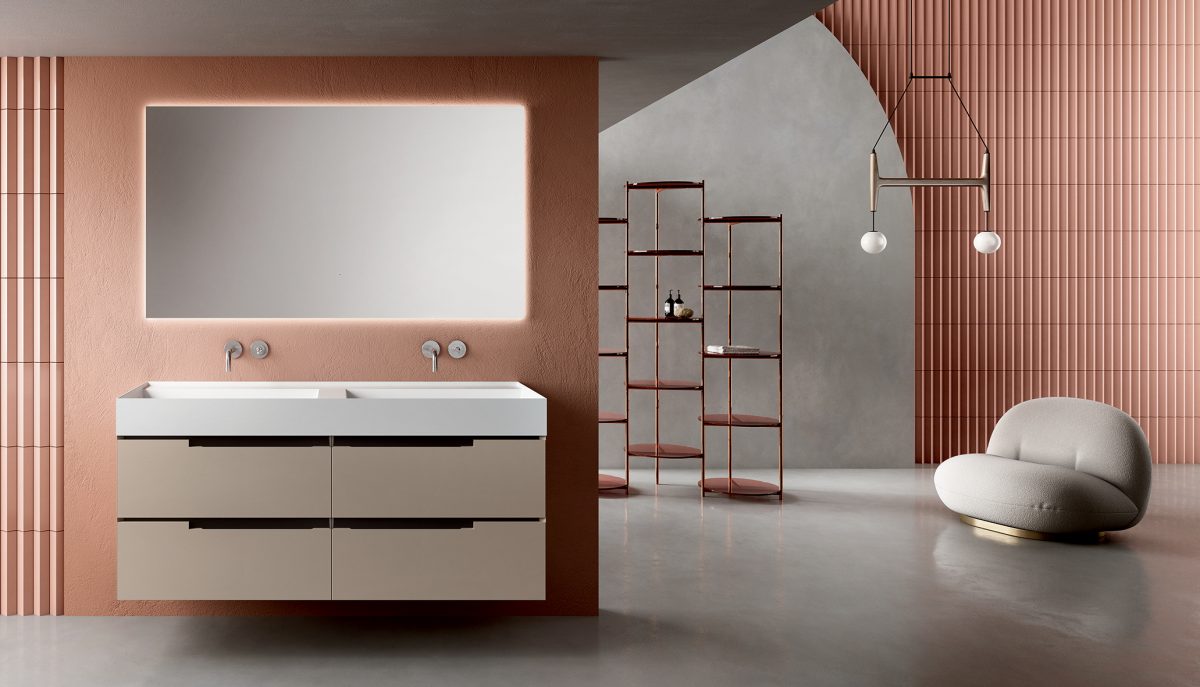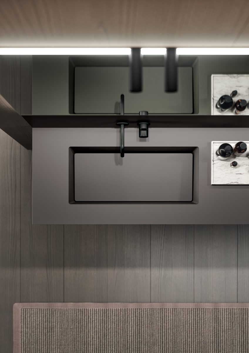 Three projections are available, as well as endless configurational possibilities. There is a wide selection of basins not to mention an extensive choice of lacquer and wood veneer finishes. Complementary items include contemporary taps, new mirrors complete with back-lighting and bathtubs in a variety of shapes and materials.