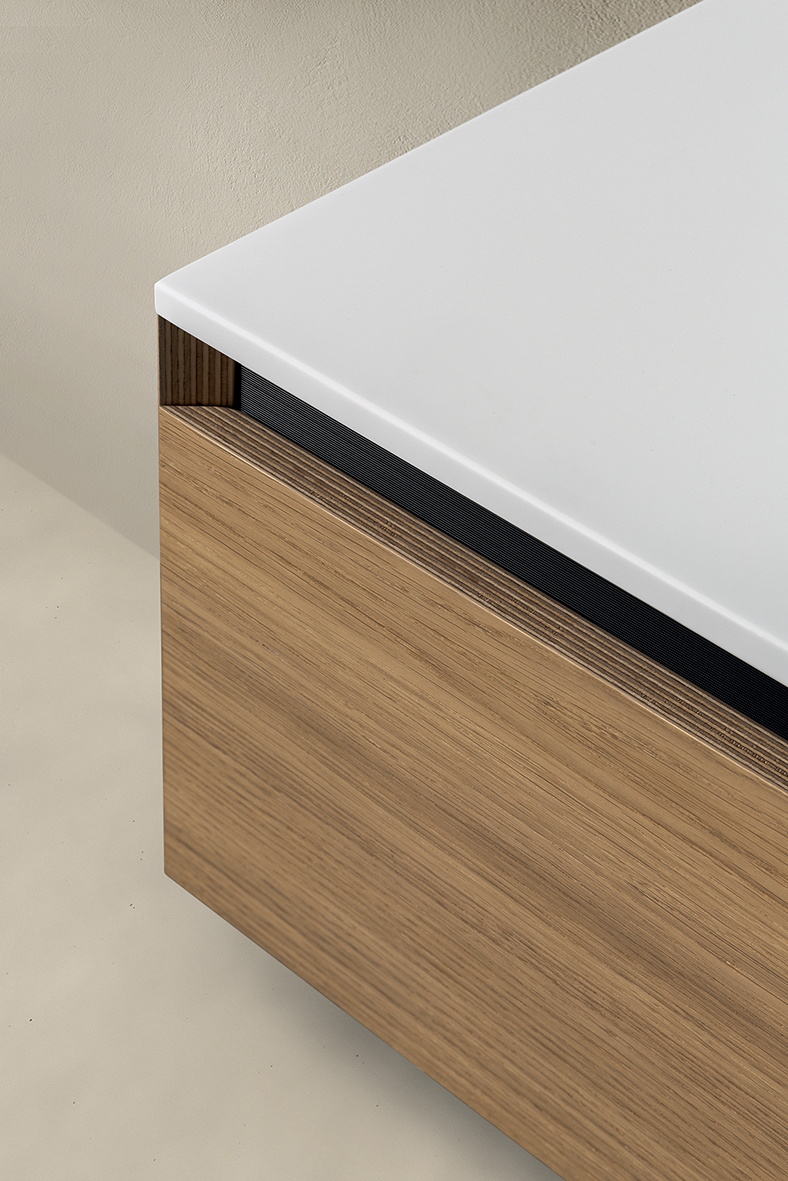 Come suggerisce il nome, il design del progetto si sviluppa lungo le tre dimensioni seguendo una linea continua, un Profilo appunto, che ne detta spazi e modularità. Questa linea, suggerita nella forma della gola che invita la mano e facilita l’apertura cassetto, disegna un tratto caratterizzante in tutto il progetto e definisce lo sviluppo dei volumi.