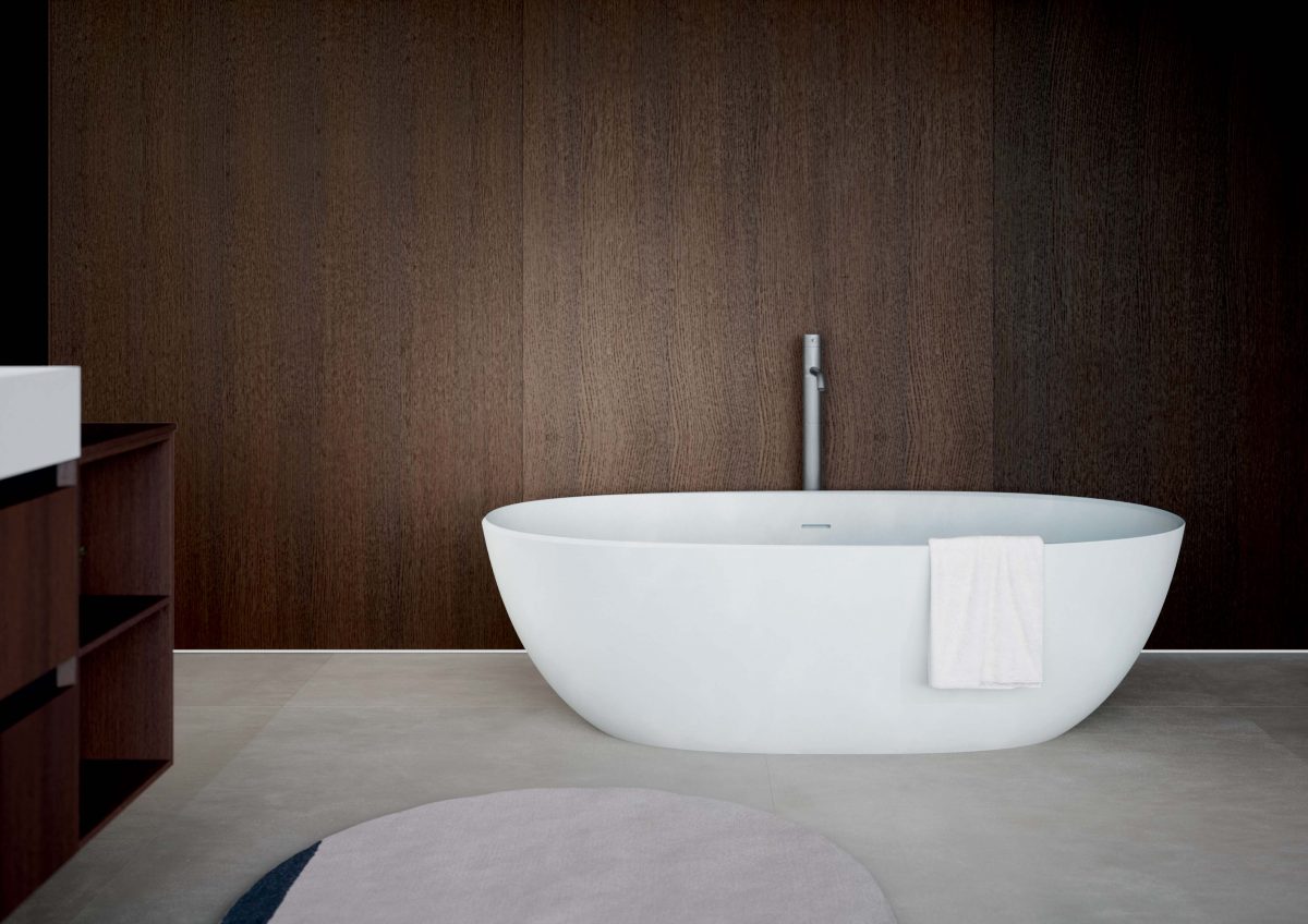 L’offre est complétée par des robinets au design high-tech, de nouveaux miroirs rétro-éclairés et une série de baignoires de formes et de matériaux différents.