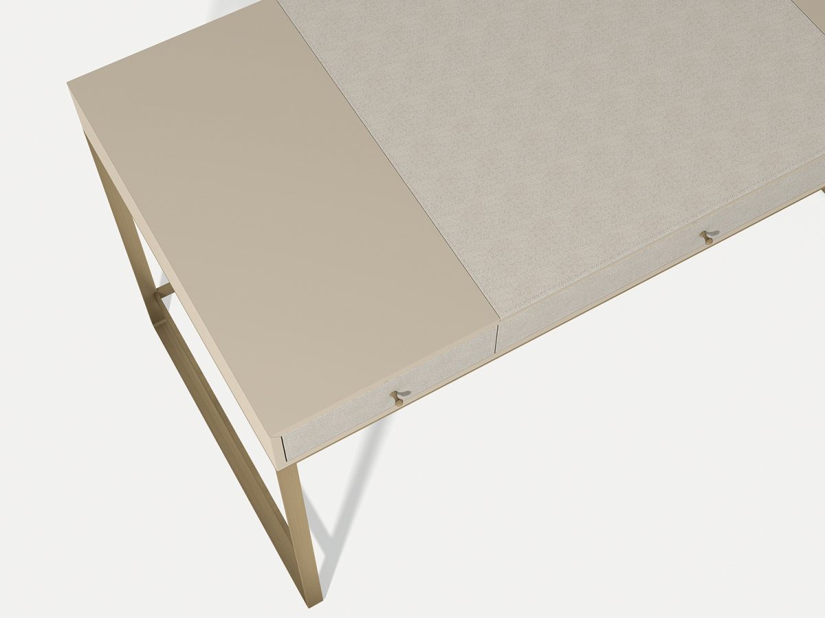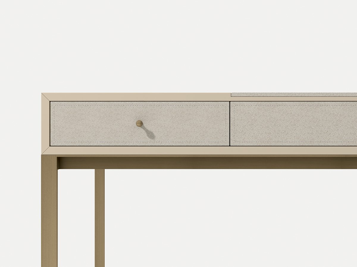 Console elegante dalle finiture raffinate, con alzate e cassetti imbottiti e rivestiti in pelle. Il piano è in pannelli impiallacciati e bordati con tranciati di rovere nelle versioni essenza, con pannelli in MDF nelle versioni laccate rivestiti con carta melamminica da laccare. I cinque cassetti e il vano centrale rivestiti in pelle in tutte le finiture disponibili. Il basamento è in metallo, disponibile nella finitura bronzo. La satinatura è ricavata tramite trattamento galvanico ed è realizzata a mano.