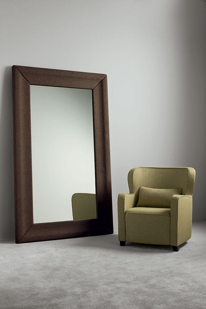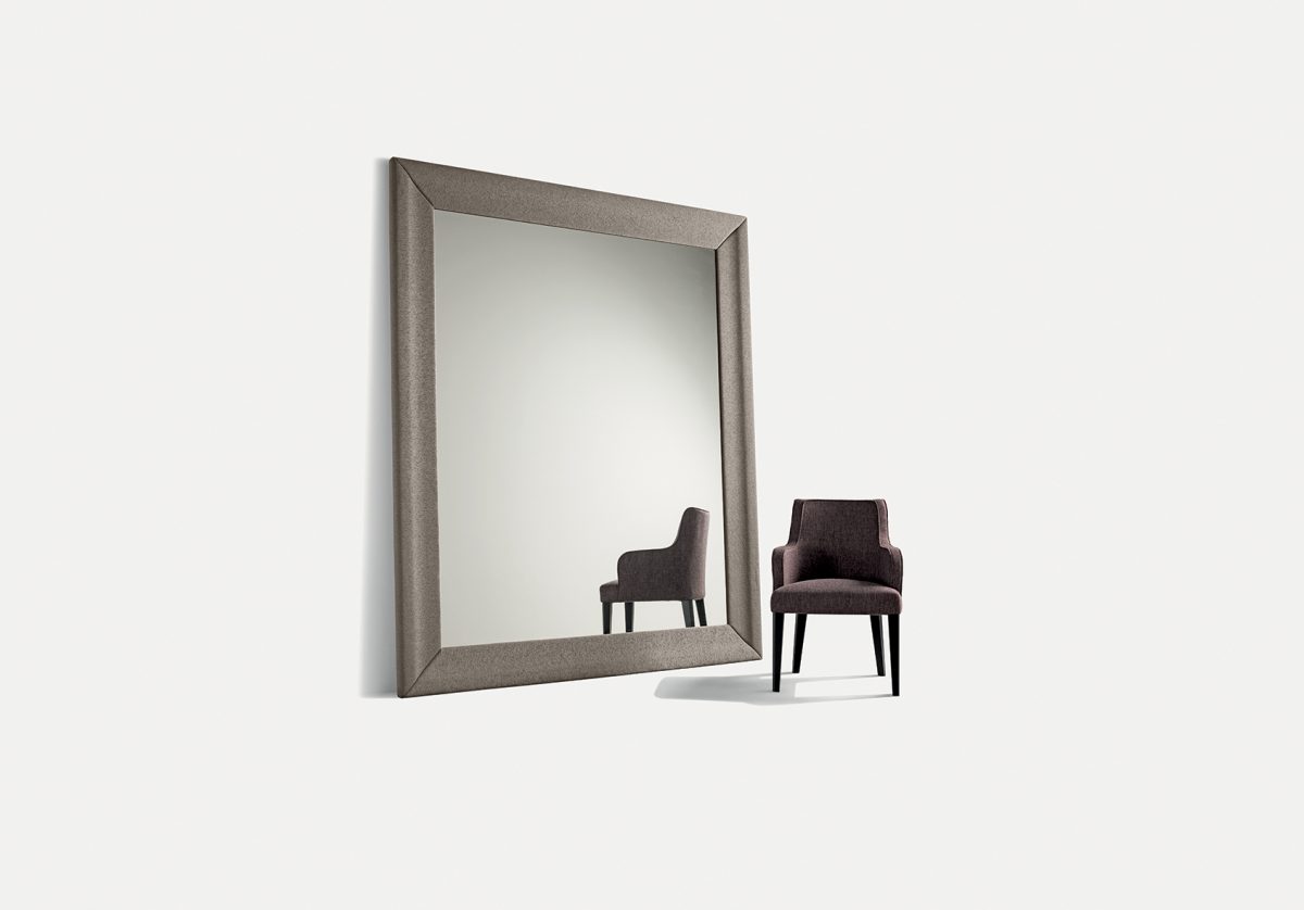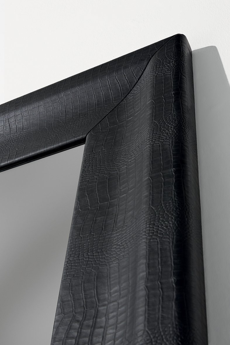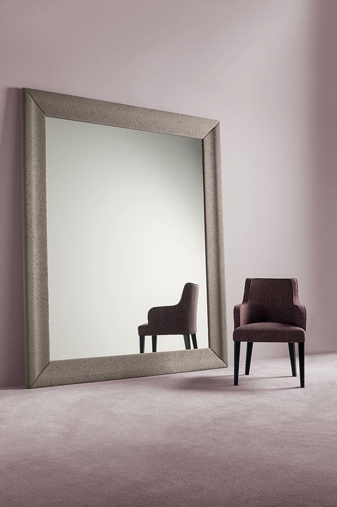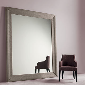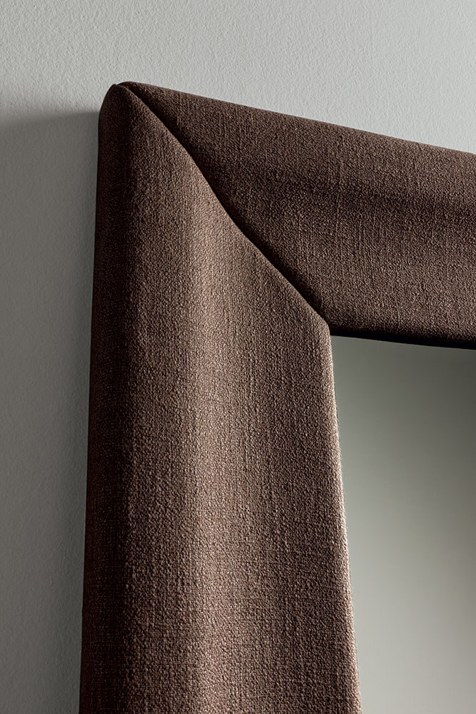Specchiera con cornice in legno massello da 5 cm di spessore rivestito in tessuto o in pelle.