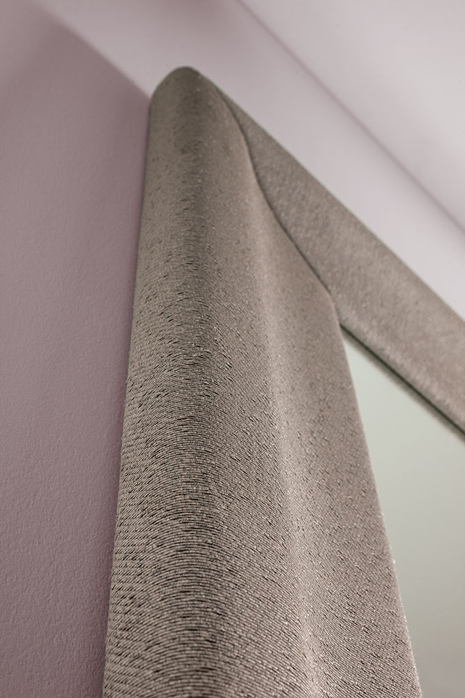 Miroir avec corniche en bois massif de 5 cm d’épaisseur revêtu en tissu ou en cuir.