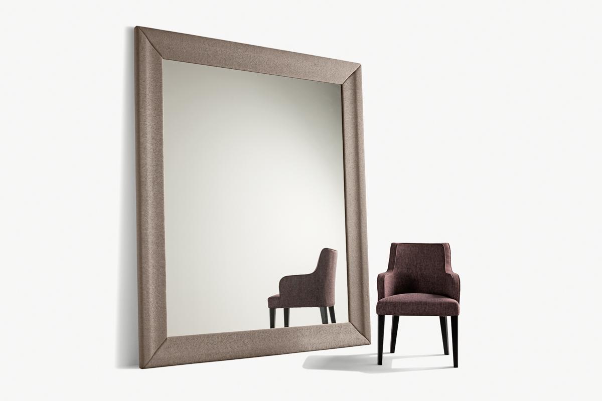 Настенное зеркало Psichè с рамой из массива дерева толщиной 5 см, оббитой тканью или кожей.