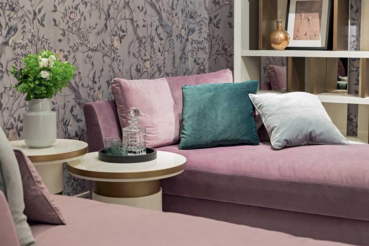 >Keywords: Sophisticated and relaxing reading room in Malva shades, the warm glow of our Moon pendant lamp, Berenson modular sofa is available in different sizes and joinable modules, modular and adjustable Magrite bookcase