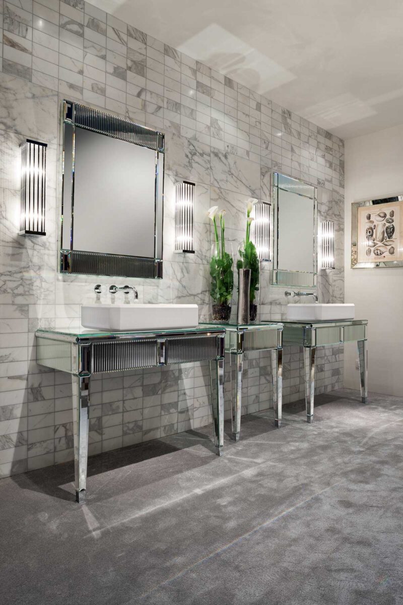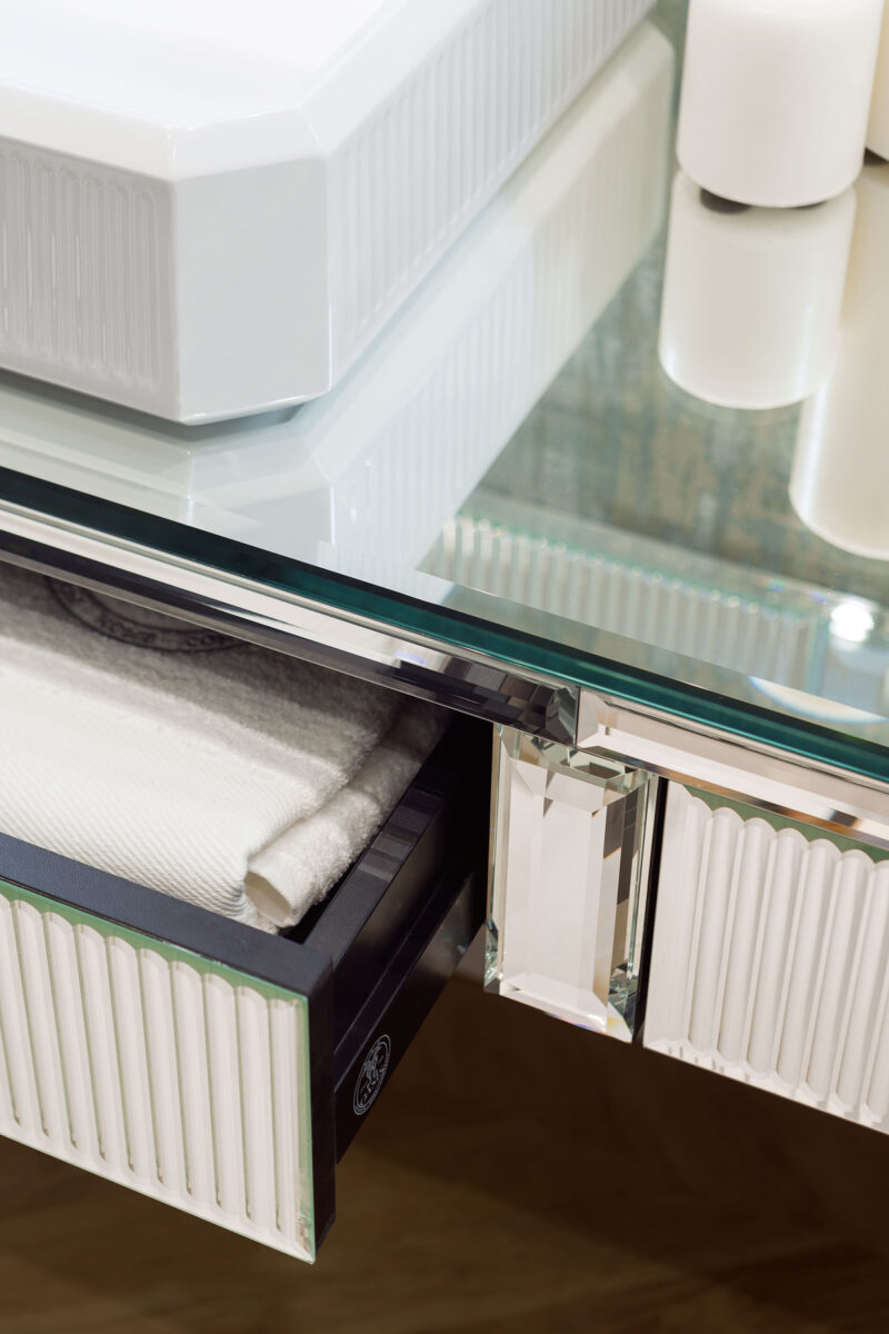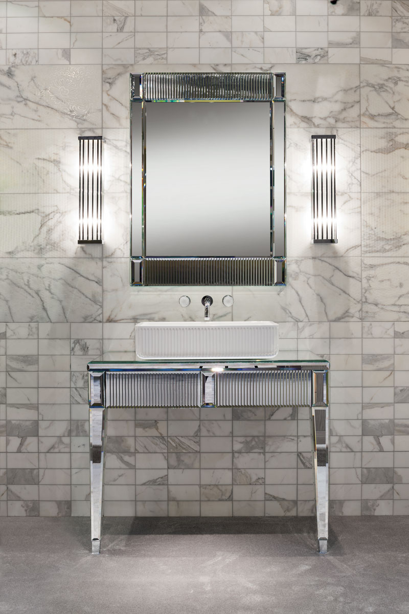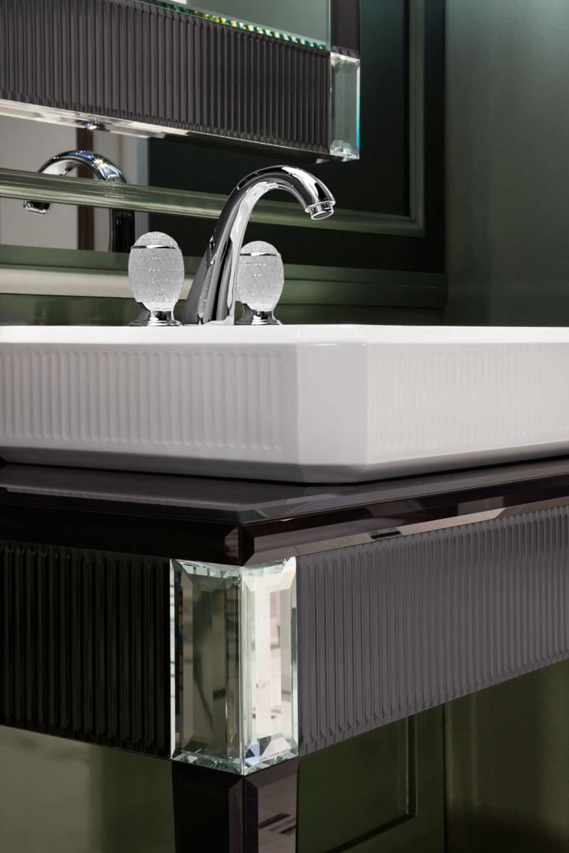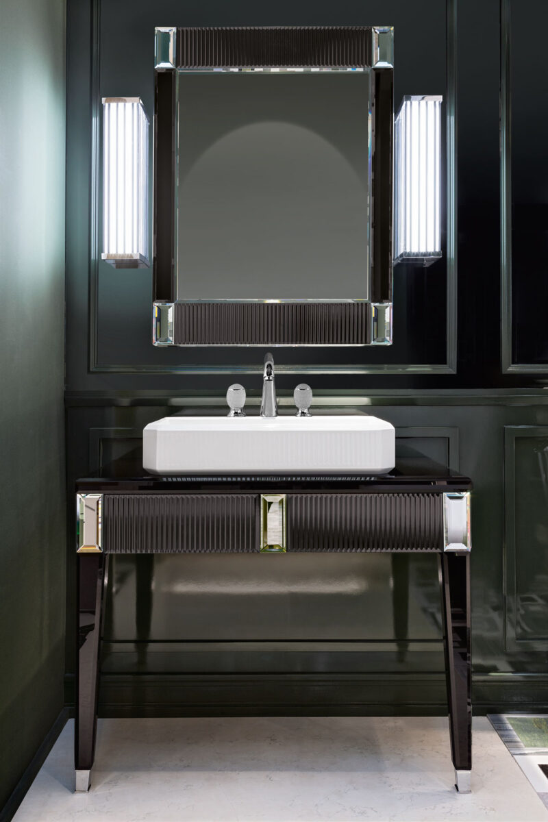 Эта коллекция олицетворяет исключительность и элегантность, черпая вдохновение в роскошных венецианских интерьерах. Строгая геометрия дизайна в стиле ар-деко подчёркнута сочетанием драгоценных материалов и тонкой работы, которые усиливают её неповторимый и притягательный характер. Коллекция Rialto включает консоль разных размеров, в комплекте с соответствующей раковиной и зеркалом. В дополнение к выдвижным ящикам, высокие шкафы могут обеспечить дополнительное место для хранения при необходимости. Каркас и столешница мебели полностью облицованы цельным стеклом — в вариантах зеркальной или чёрной отделки. Фасады ящиков, рамы зеркал и края высоких шкафов украшены уникальным «ребристым» или «гофрированным» декором, а геометрические элементы ножек напоминают огранённый алмаз. Накладная раковина выполнена из белой глянцевой смолы и также имеет «ребристый» декор.