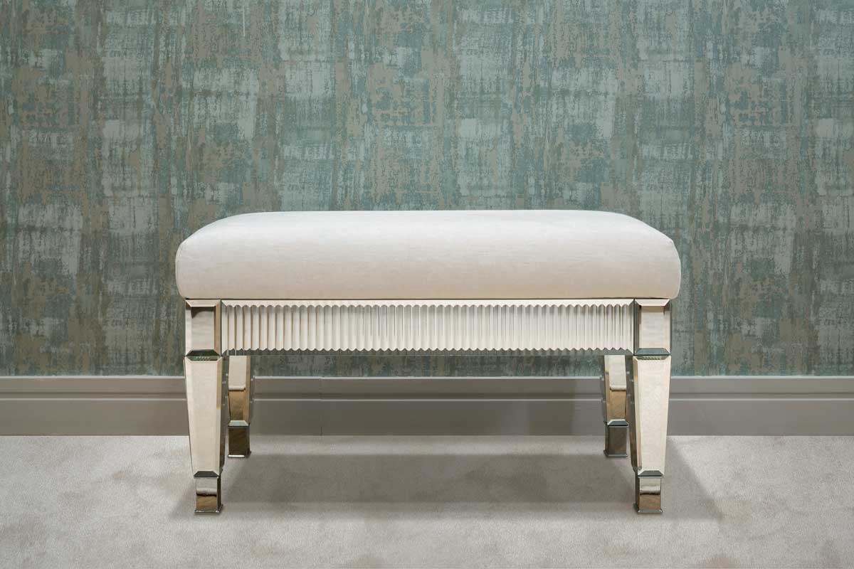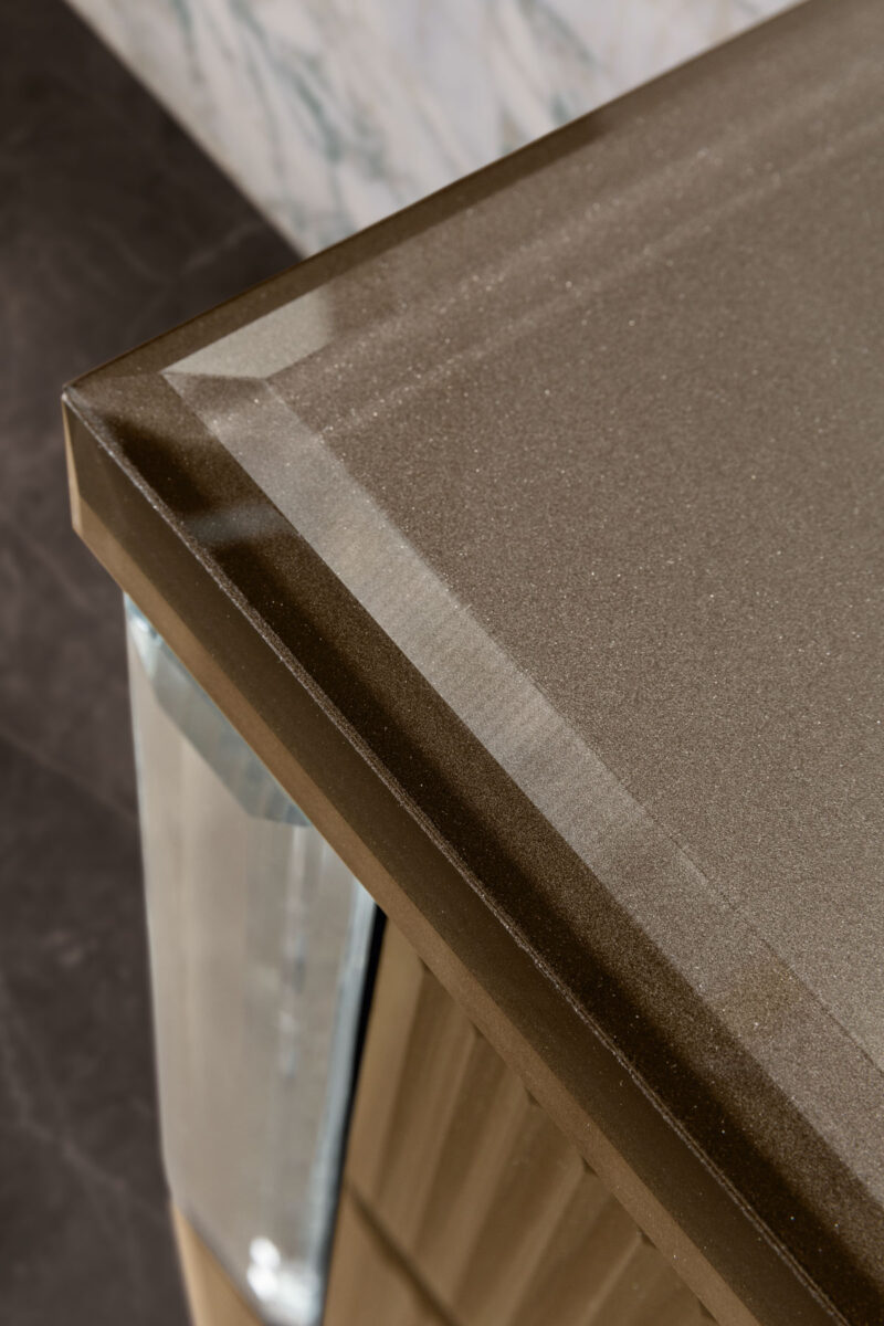 Каркас и столешница мебели изготовлены из цельного стеклом, предлагаются отделки из зеркала или черного стекла
