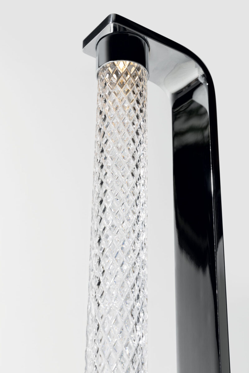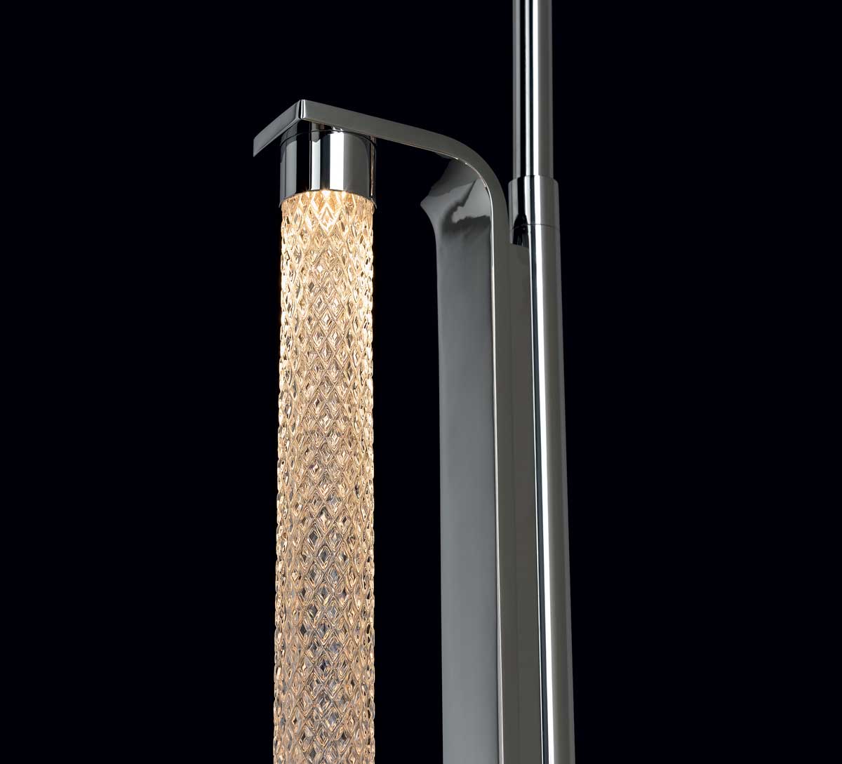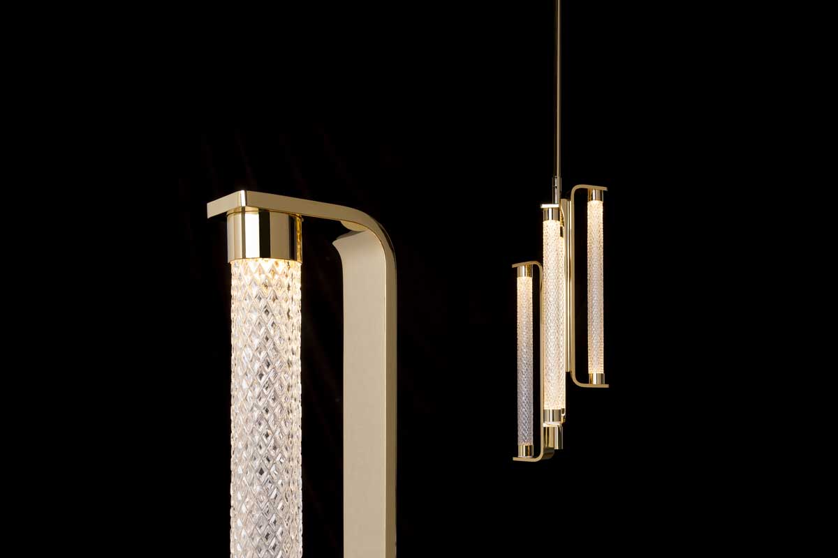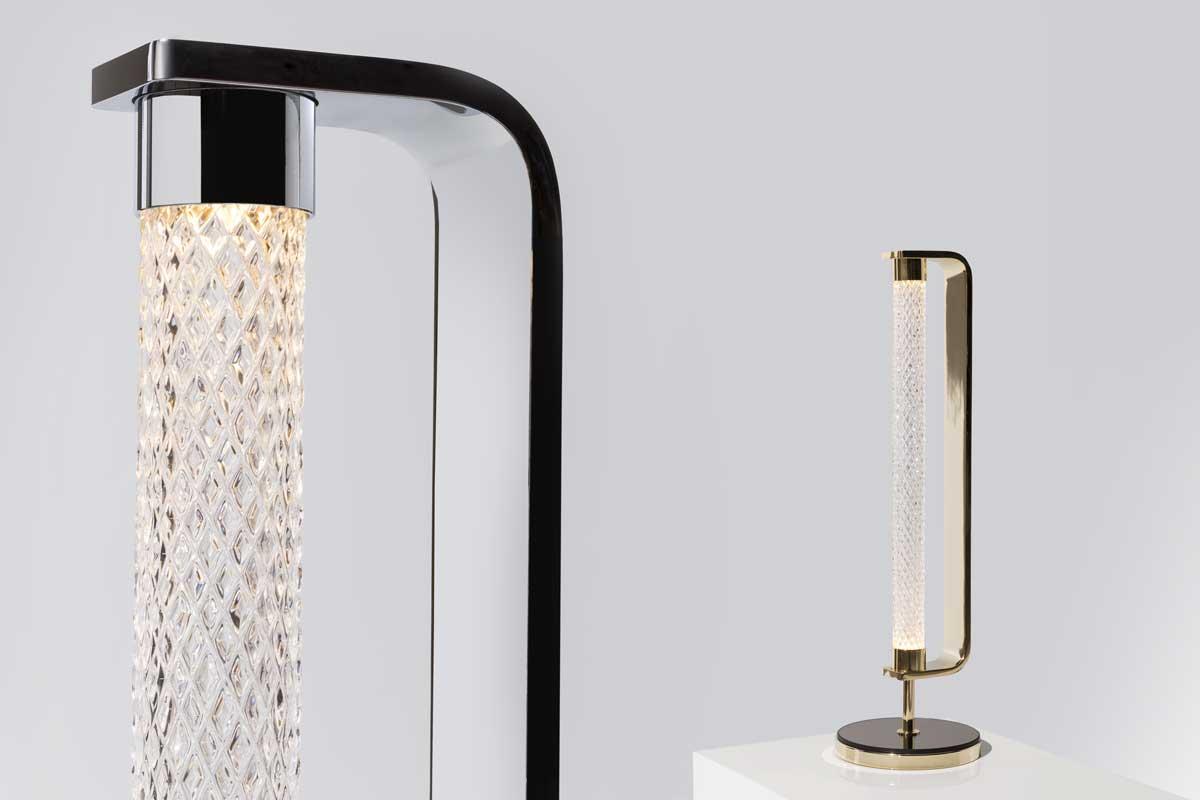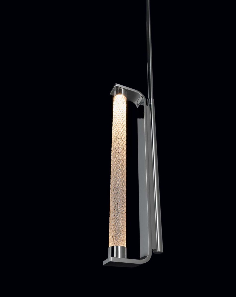 >Keywords: strong personality embodying a style, the bow of a violin, classical tradition synonymous with music, artisanal hand-made crystal, contemporary lamp, pendant, table and wall-mounted applique versions