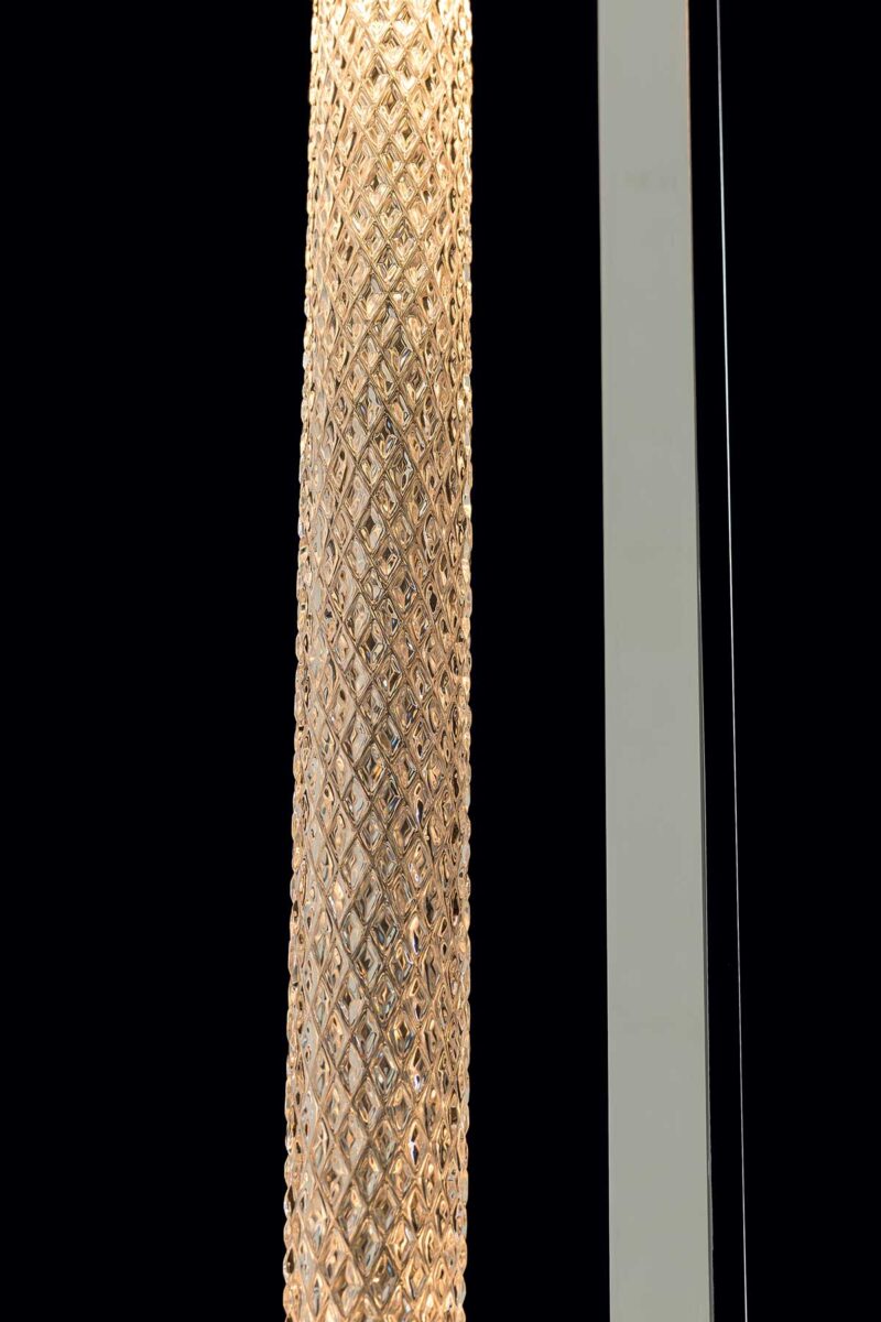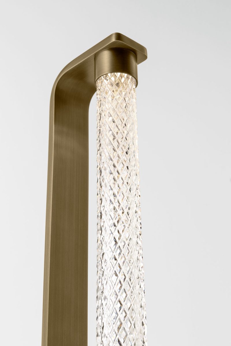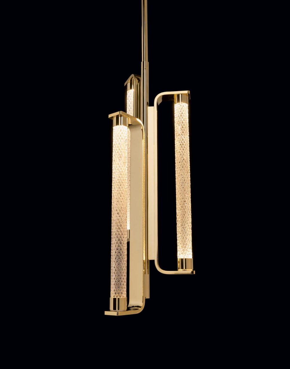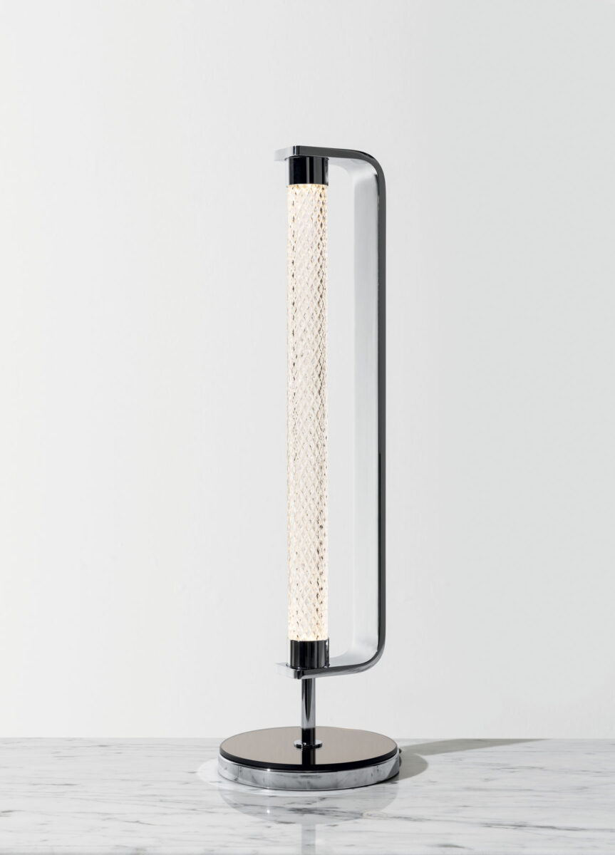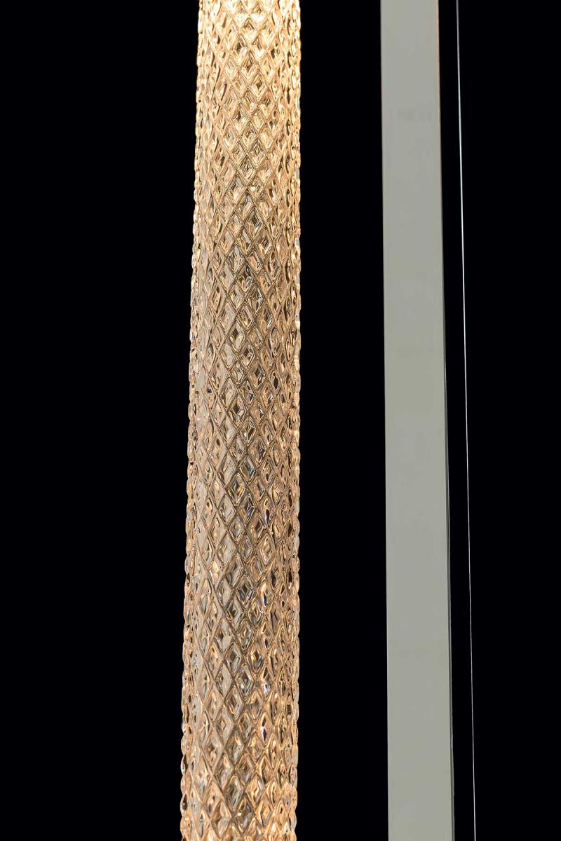 >Keywords: strong personality embodying a style, the bow of a violin, classical tradition synonymous with music, artisanal hand-made crystal, contemporary lamp, pendant, table and wall-mounted applique versions