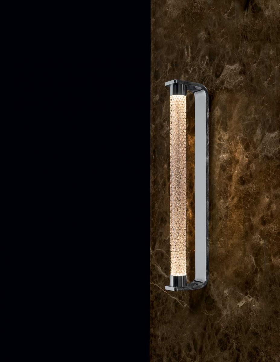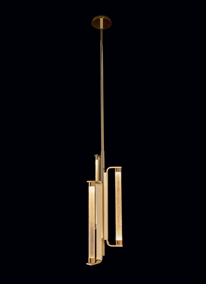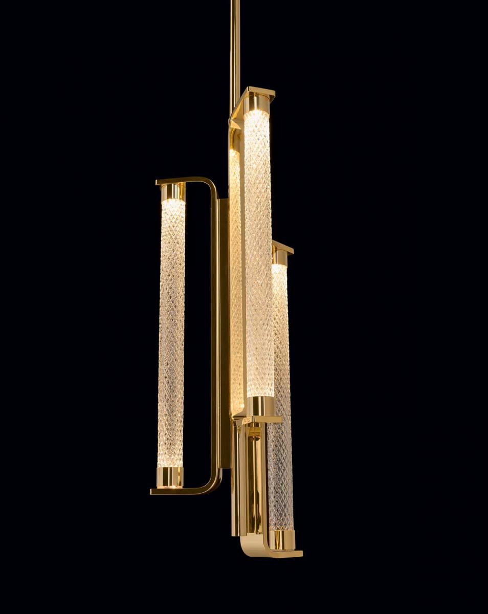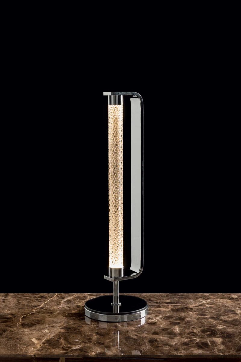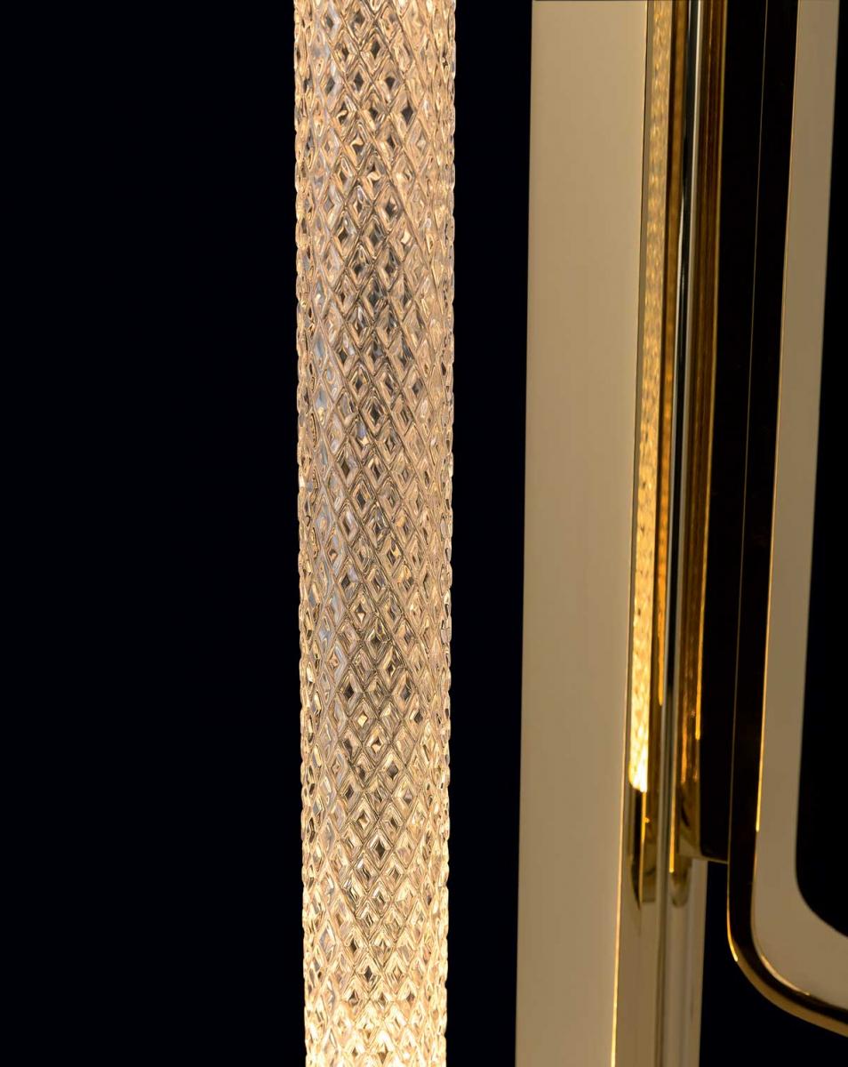 >Keywords: strong personality embodying a style, the bow of a violin, classical tradition synonymous with music, artisanal hand-made crystal, contemporary lamp, pendant, table and wall-mounted applique versions