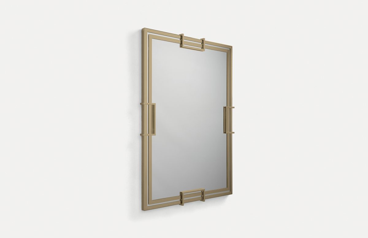 Valentino is a mirror with a simple frame but strong identity, characterized by a graphic sign of great effect. Inspired by a geometric Art Deco style, it has a double metal frame with decorative handles in 10×10 mm thick tube. The finishes of the metal structure are in gold or chrome.