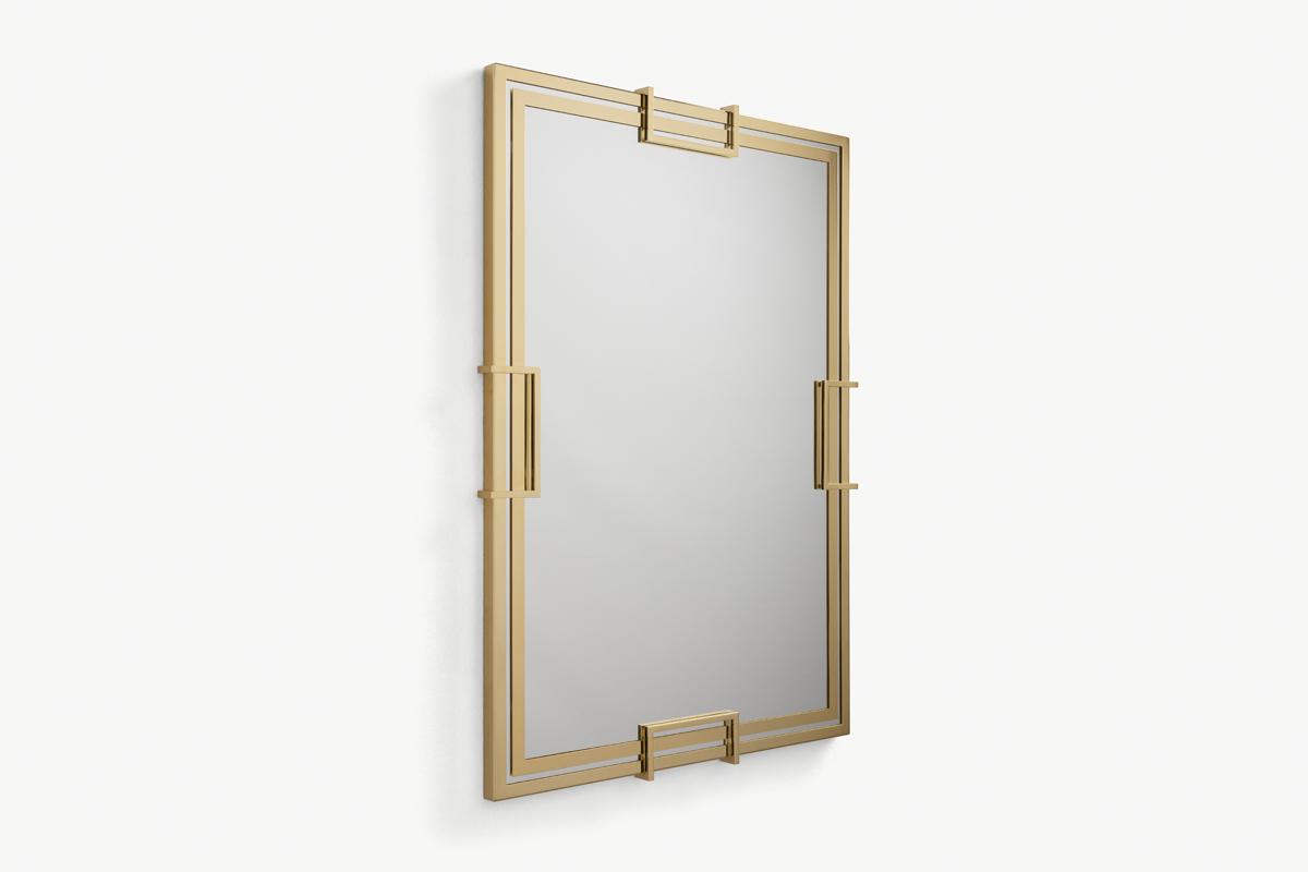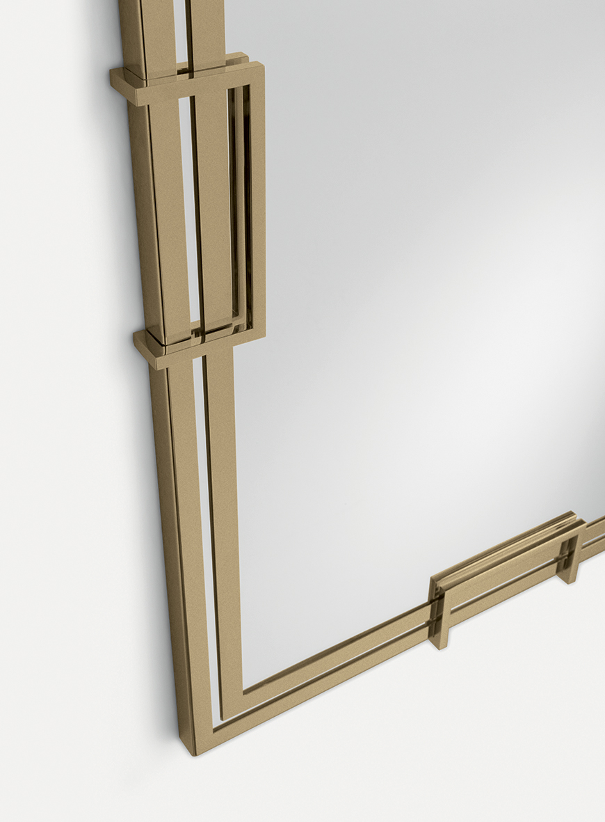 Una specchiera dalla cornice rigorosa ma dalla forte identità, caratterizzata da un segno grafico di grande effetto. Ispirata a uno stile geometrico Art Déco, ha una doppia cornice in metallo, con maniglie decorative in tubo di spessore 10×10 mm. Le finiture della struttura in metallo sono in oro o cromo.